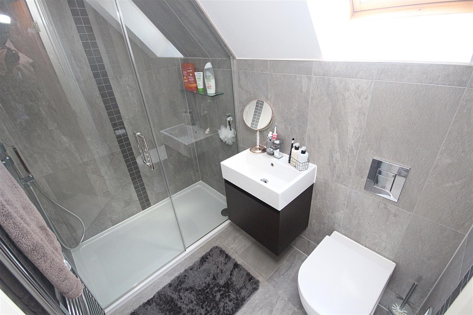 Fitted only one month ago, fully porcelain tiled throughout with corner shower enclosure, low level WC, oversized hand wash basin inset to vanity unit, chrome heated towel rail, shaving light, demister vanity mirror, obscure window to rear aspect, smooth ceiling with inset downlights.