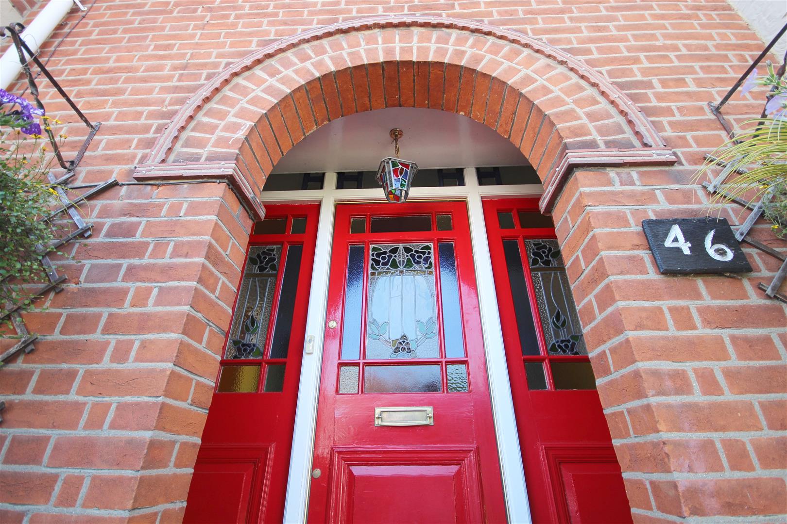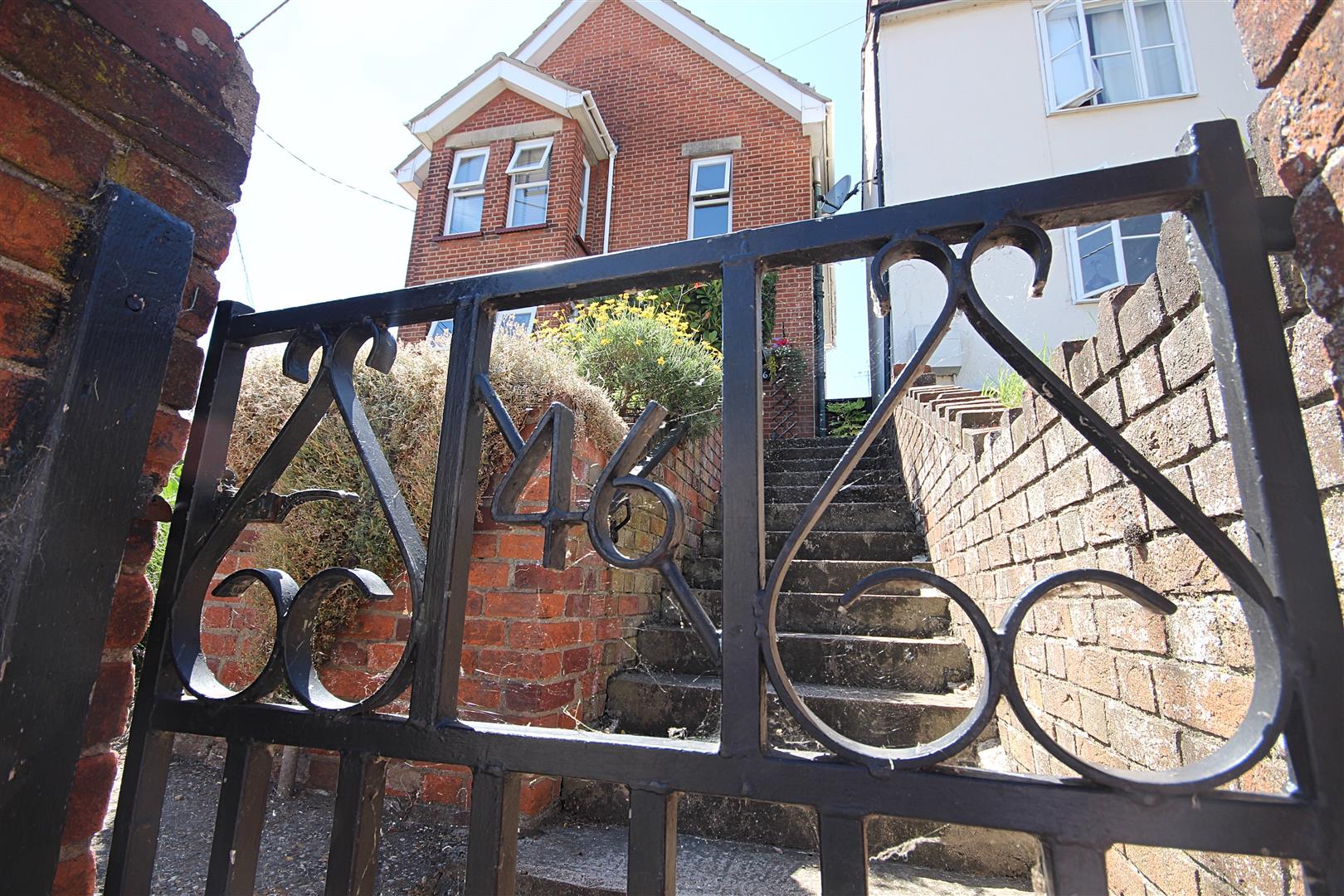 Retaining brick wall to front, with entrance gate and path to front entrance door. Garden laid mainly to lawn with border flower beds. Side access gate to rear garden