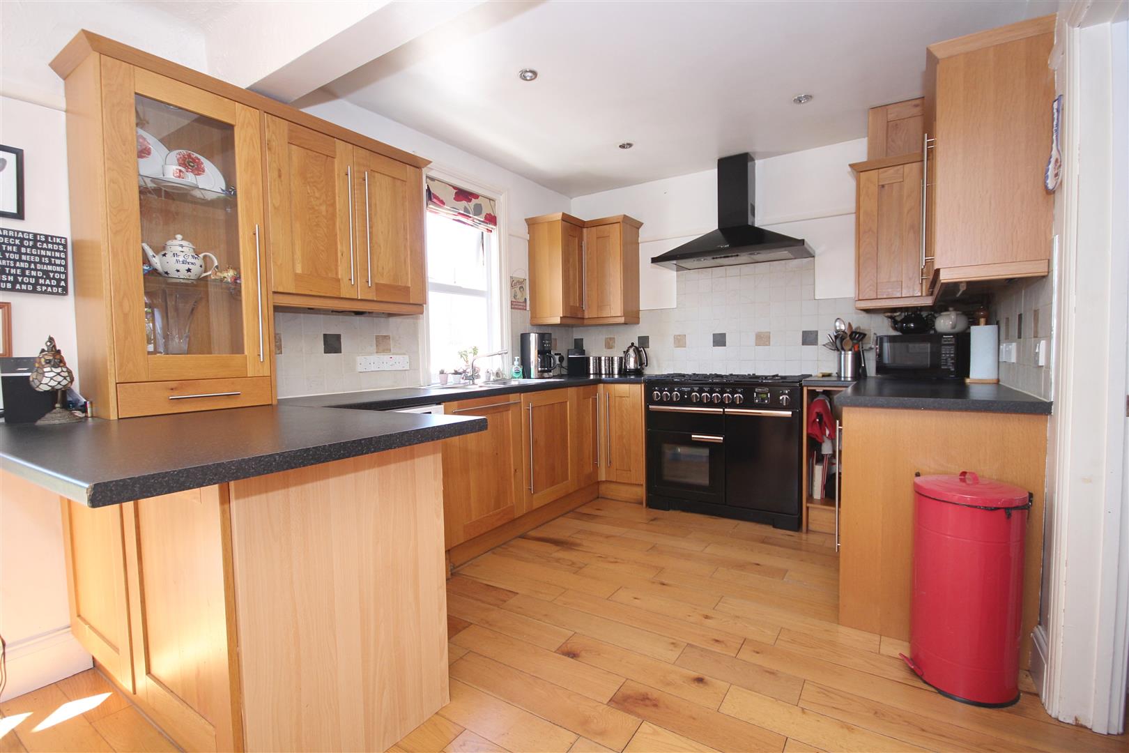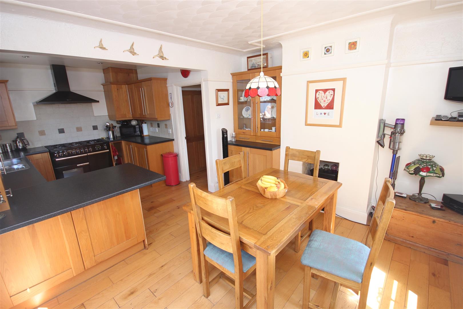 Double glazed window to the rear aspect, fitted kitchen suite with matching wall and base level units, under counter lighting, sink with mixer tap inset to work surface, spaces for Washing Machine, Dishwasher, and Fridge-Freezer, space for Gas RangeMaster oven, with fitted Chimney style extractor over. Dining Area with window to side aspect, wooden flooring with French doors opening to rear garden.