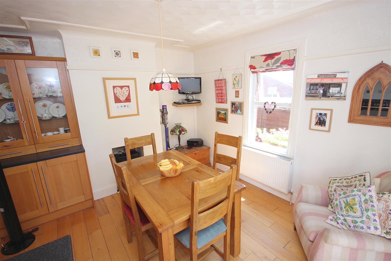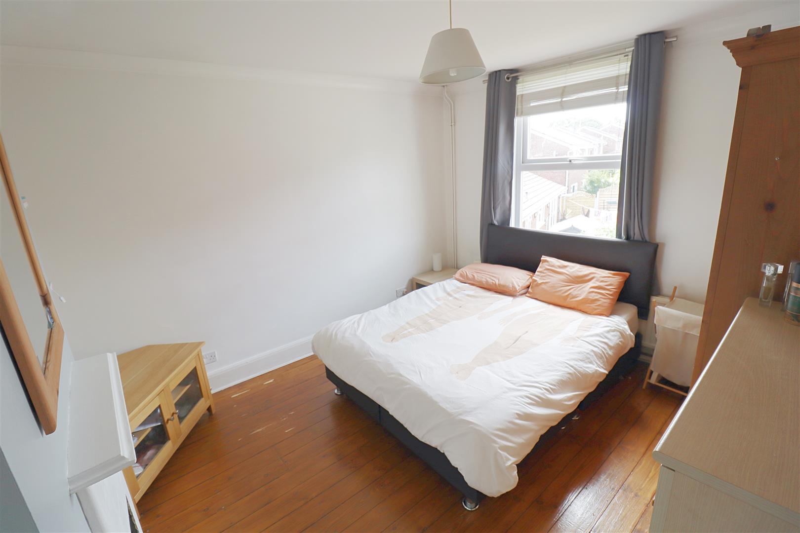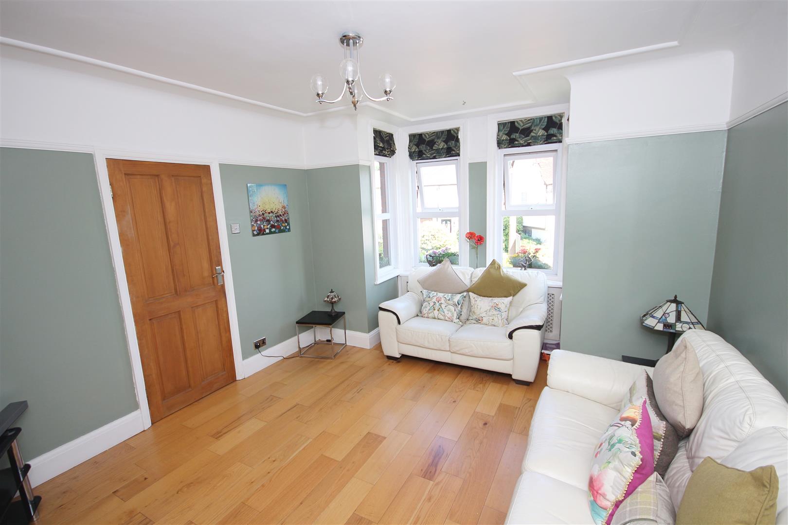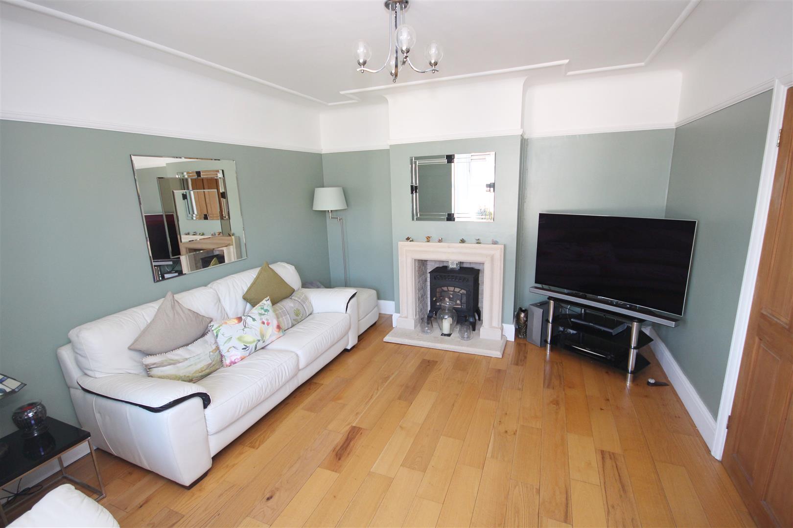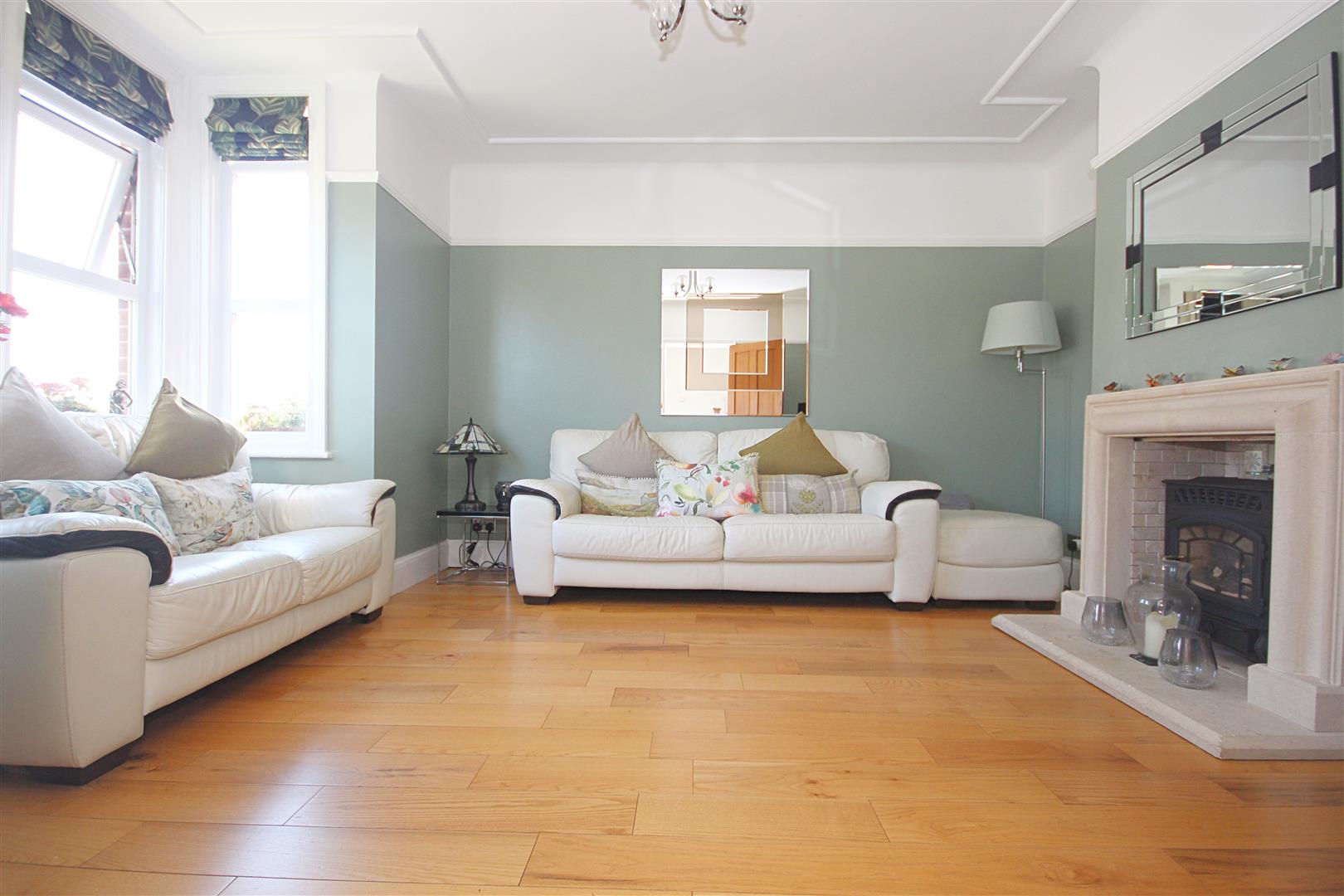 Wood flooring, open fireplace, bay window to front aspect, radiator, TV point, smooth finish ceiling with picture rails intact.