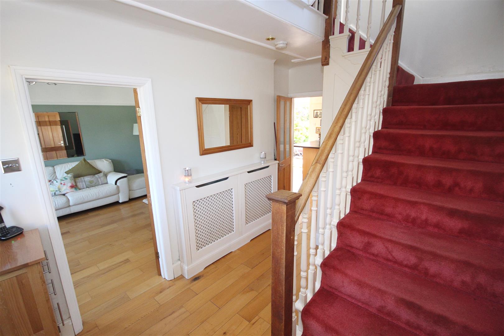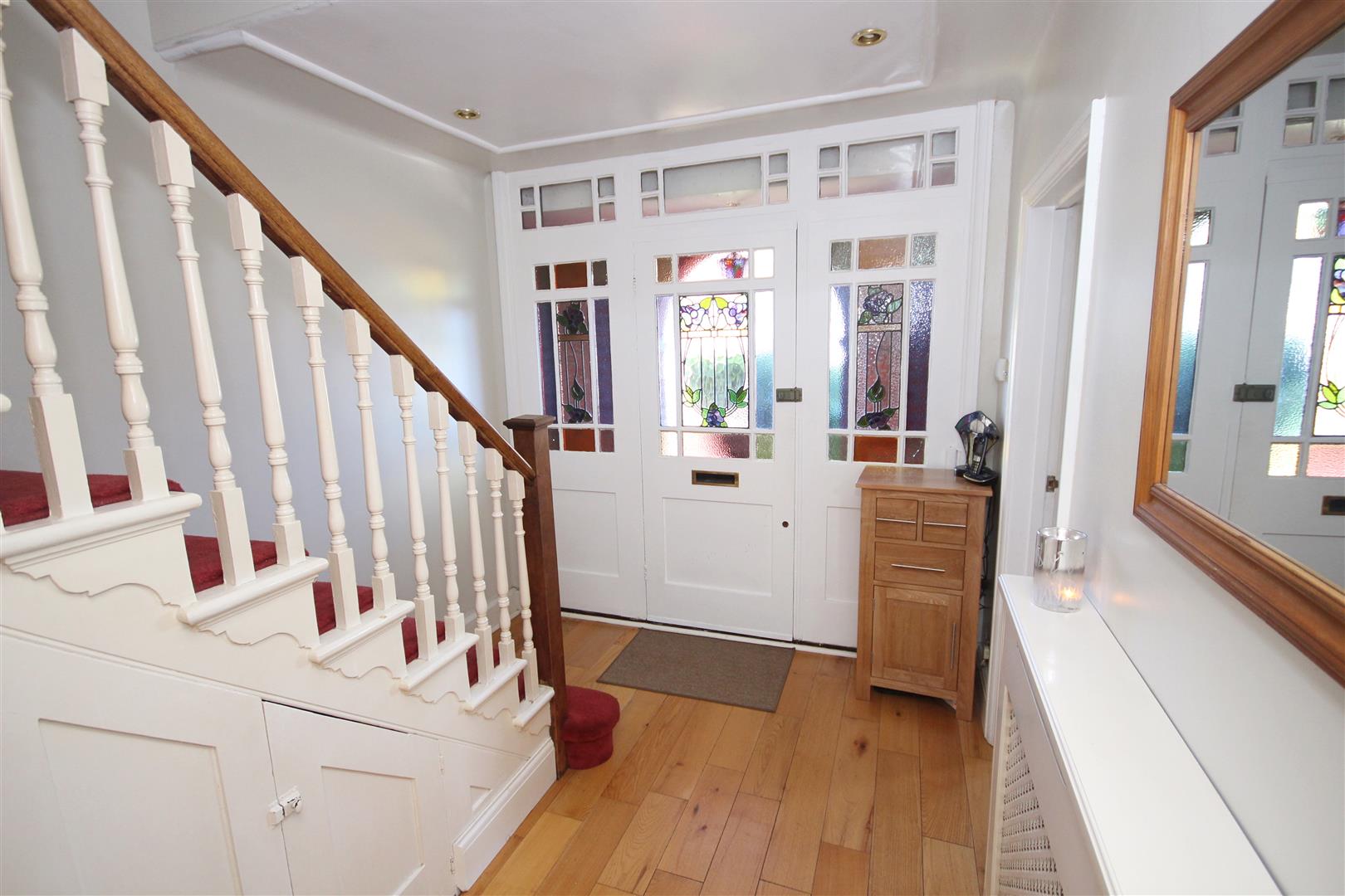Entering via external storm entrance porch, polished wood flooring, with stairs rising to the first floor. Radiator, under stairs cupboard, doors to remaining reception rooms.