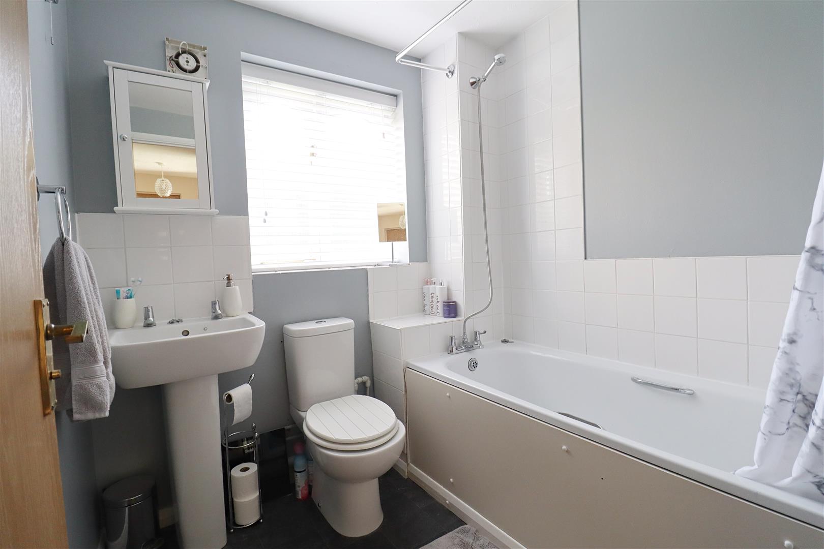 Shower over bath, WC, hand wash basin