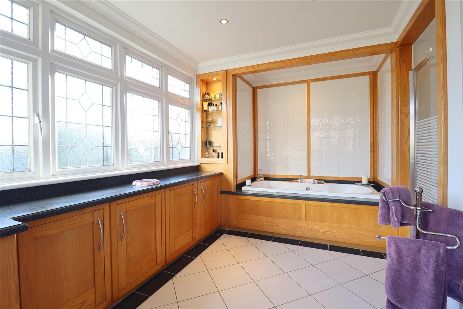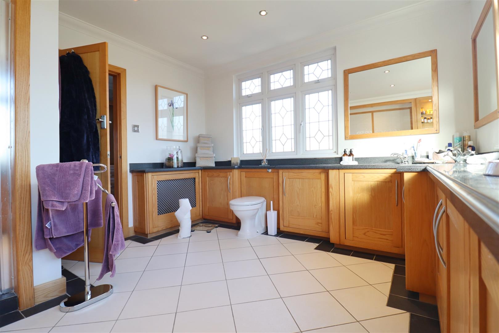 Tiled flooring, oversized bath, walk in double shower enclosure, WC, hand wash basin inset to vanity unit, range of handmade storage units, smooth ceiling with down-lights.