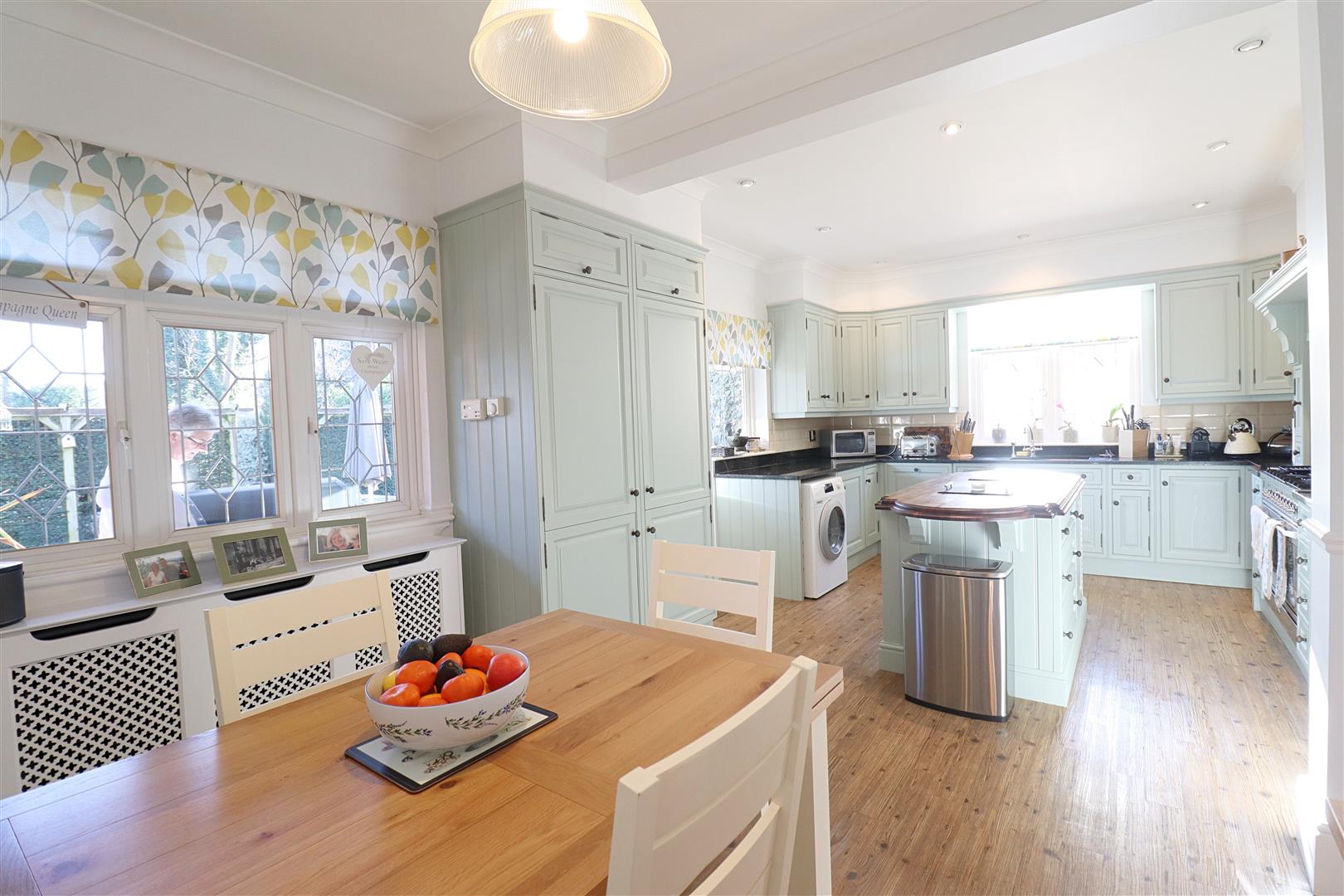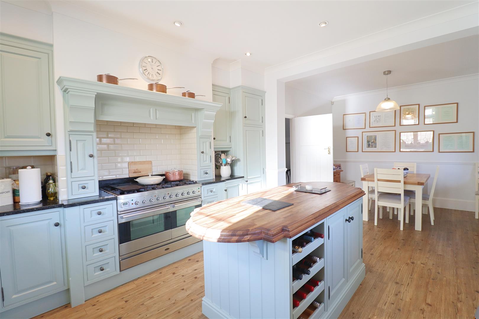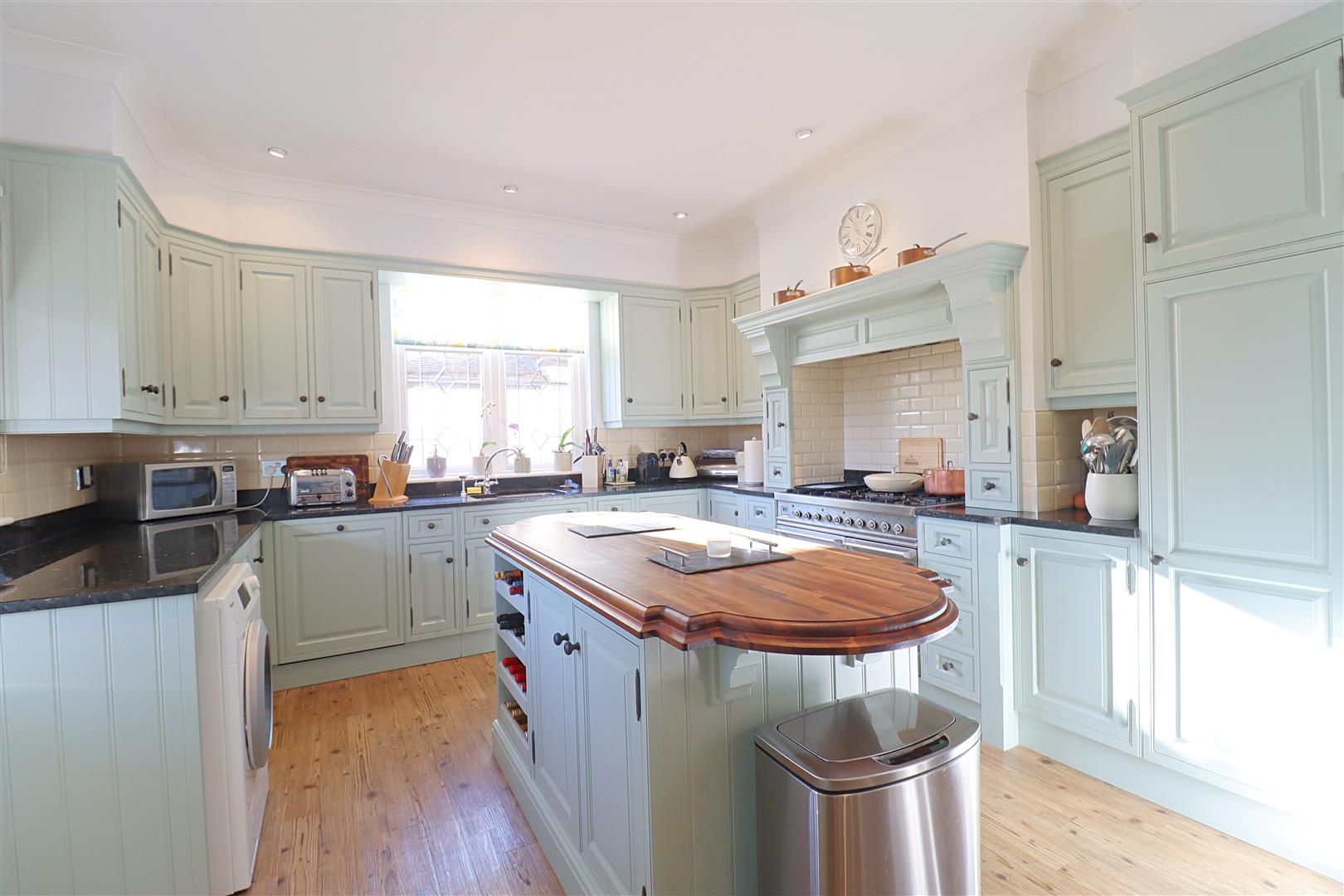 Karndean flooring, double glazed windows to side & rear aspects, door to rear. Handmade Kitchen with an array of wall & base shaker style units incorporating central island, fitted range style oven with extractor over, integral fridge/freezer & dishwasher, space for washing machine, one & a half stainless steel sink with mixer tap, granite worktops with matching upstands. Smooth ceiling with inset down-lights.