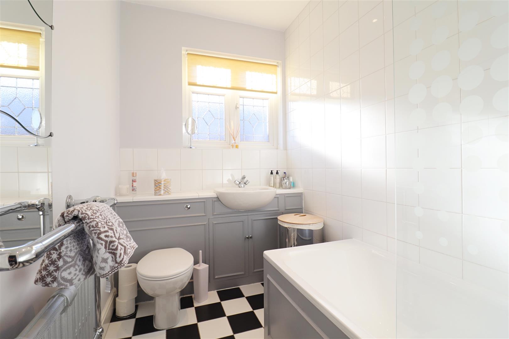 Bath with shower over, WC & hand wash basin inset to vanity unit, towel radiator, obscure double glazed window to side aspect, tiled flooring.