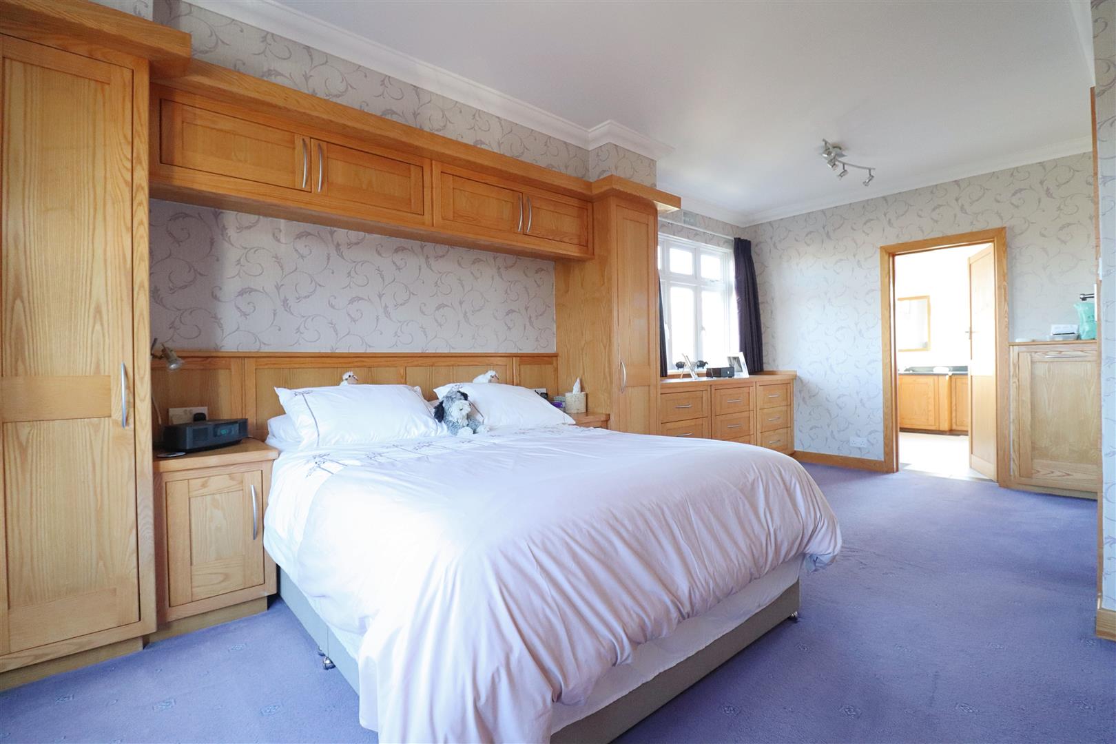 Double glazed bay window to front, radiator, carpet flooring, double glazed window to side, range of fitted wardrobes & dressing furniture, door to;