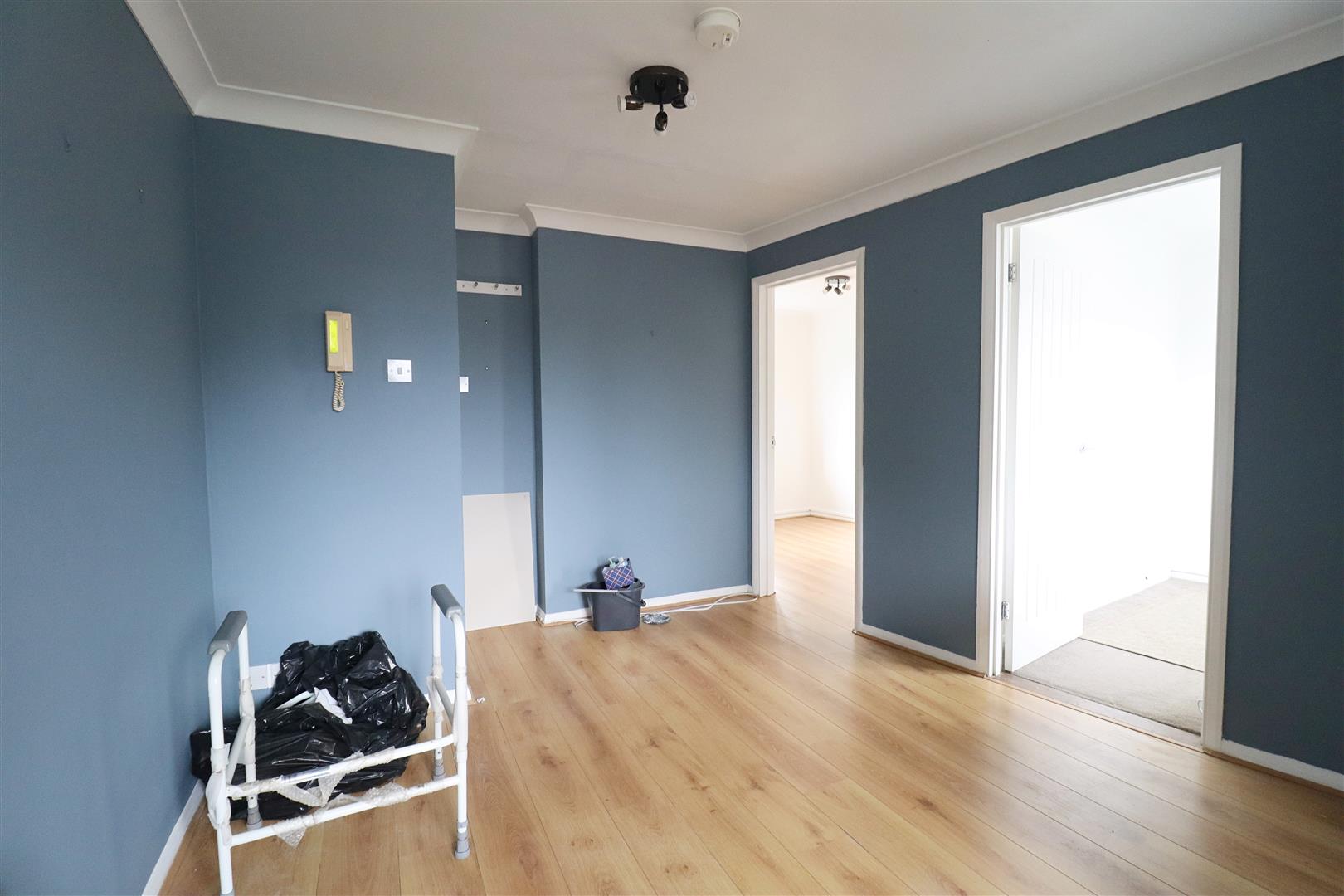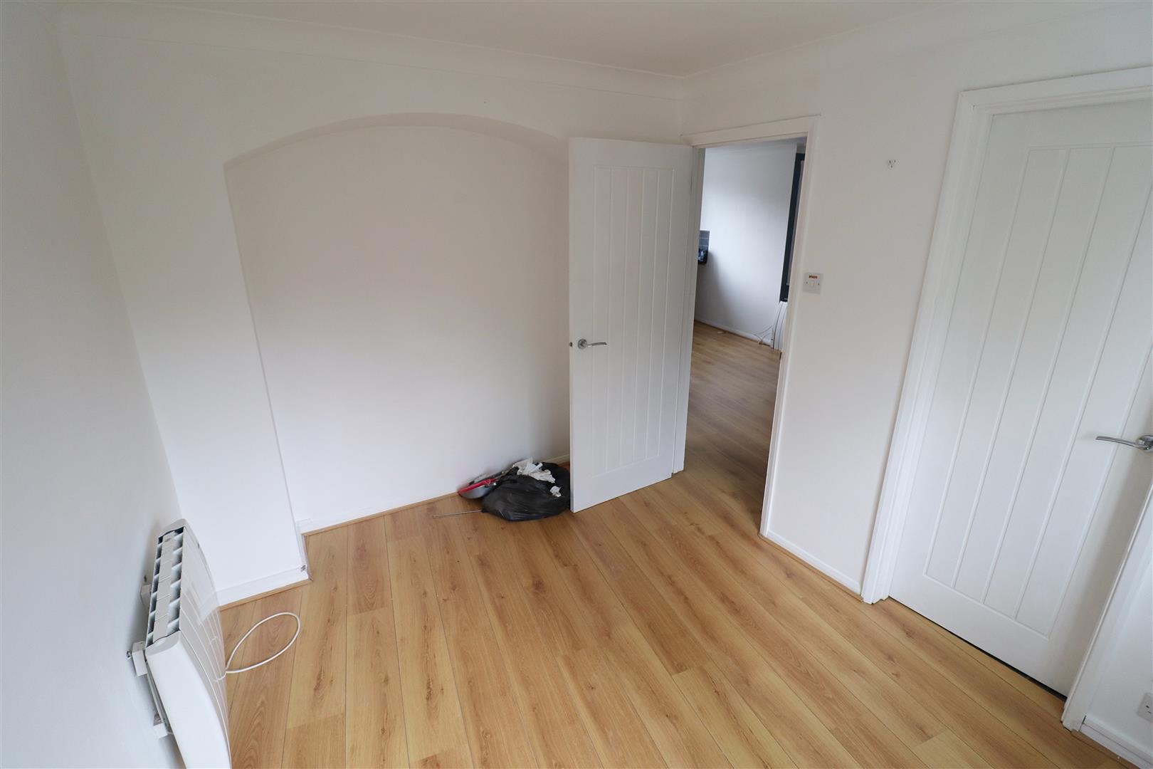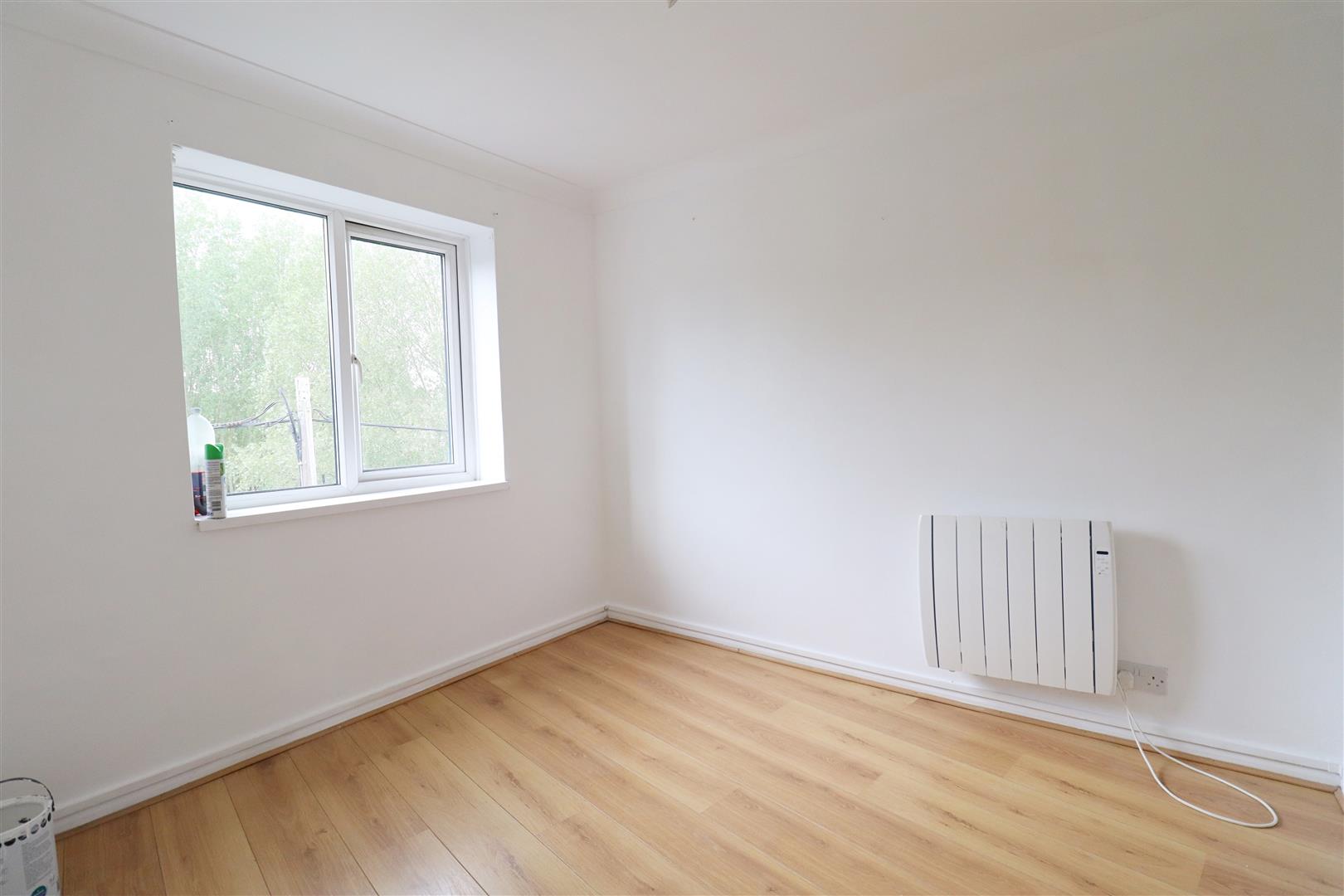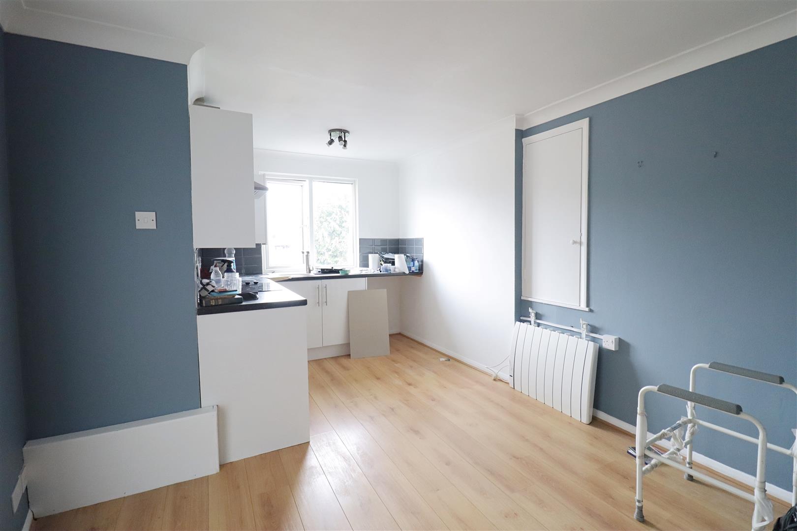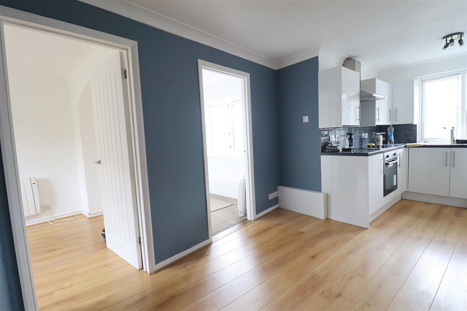 Laminate flooring, window to rear. Kitchen comprising of wall & base units, integrated oven, spaces for appliances.