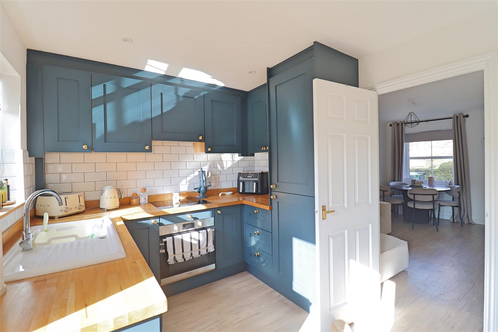 Luxury vinyl flooring, French doors and window to rear, inset oven with ceramic hob and extractor fan, sink with mixer tap and drainer, washing machine and fridge freezer integrated