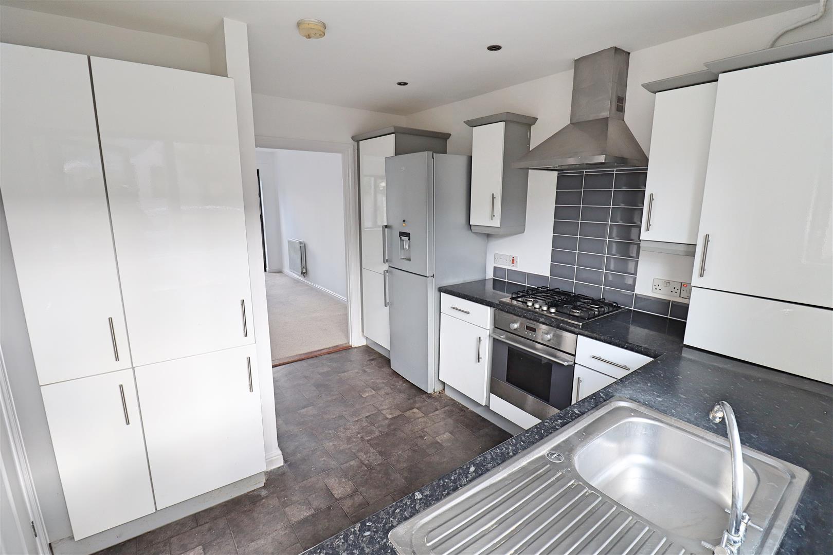 Vinyl flooring, large double glazed window to front, matching wall & base units with roll edged work surfaces, stainless steel sink, integral oven, four ring gas hob with extractor over, spaces for fridge/freezer & washing machine, opening to;