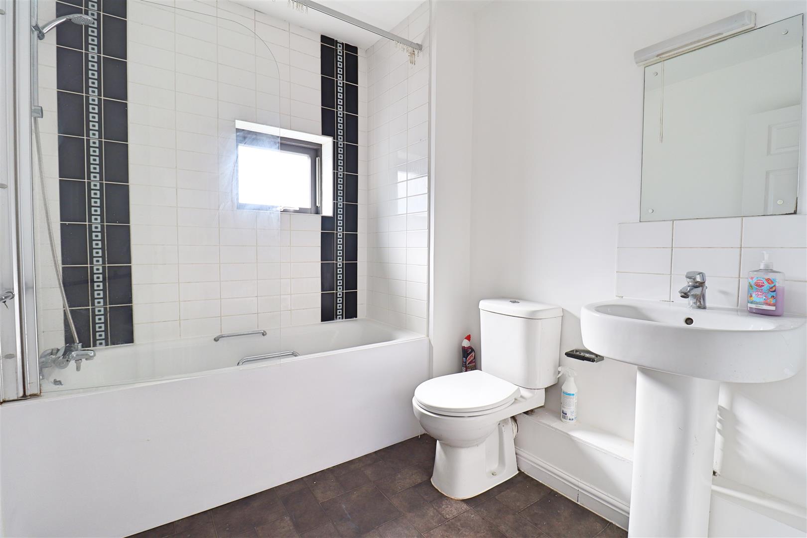 Vinyl flooring, Bath with shower over, hand wash basin & WC, spotlights, radiator, obscure double glazed window.