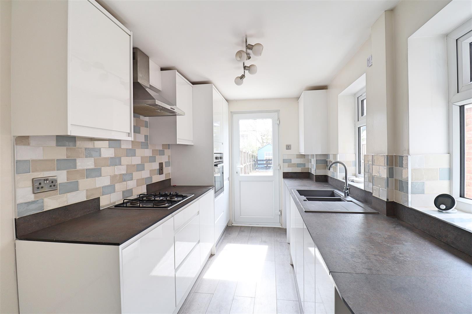 Matching wall and base level high gloss units, laminate flooring, double glazed windows to side aspect, door to rear garden, spaces for Fridge-Freezer, Washing Machine, and Dishwasher. Integral oven, four ring gas hob with extractor over.