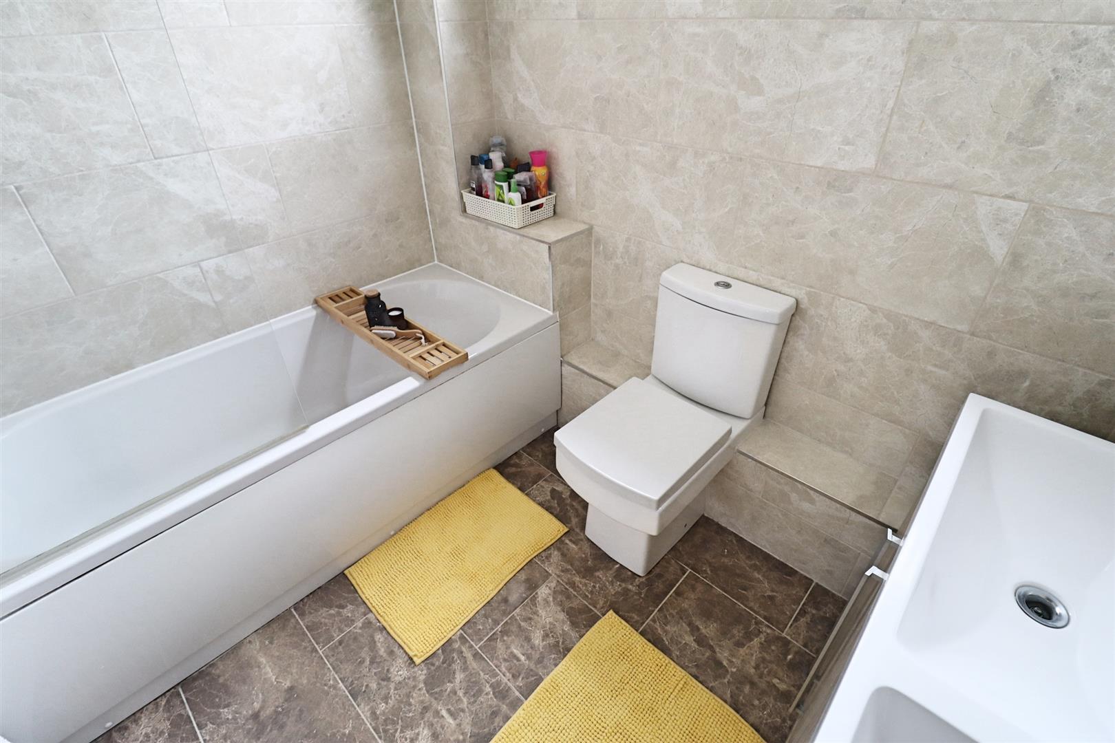 Tiled flooring, bath with shower over, wash hand basin inset to vanity unit, WC, obscure double glazed window to rear.