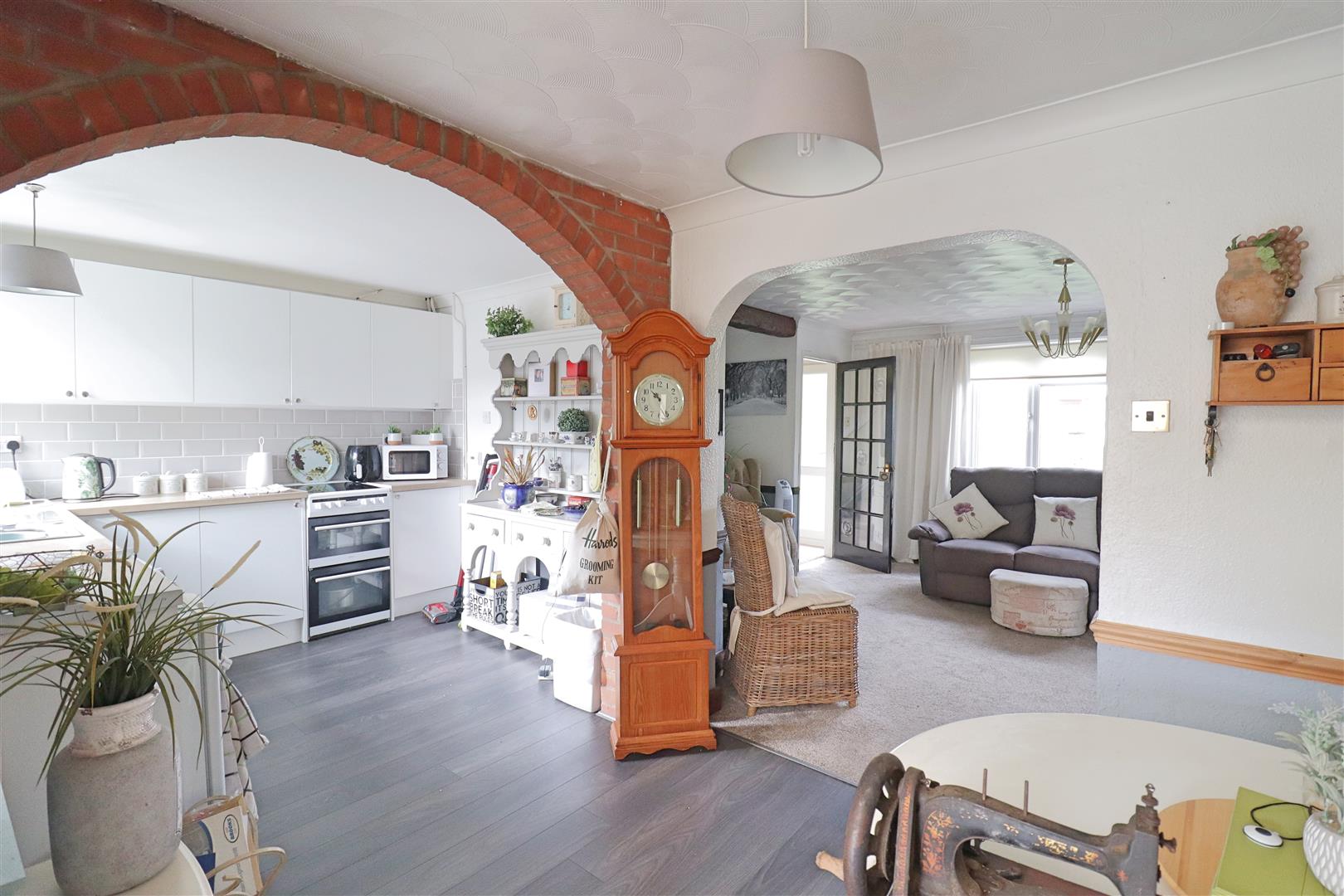 Carpet flooring, feature fireplace, radiator, double glazed window to front, opening to;