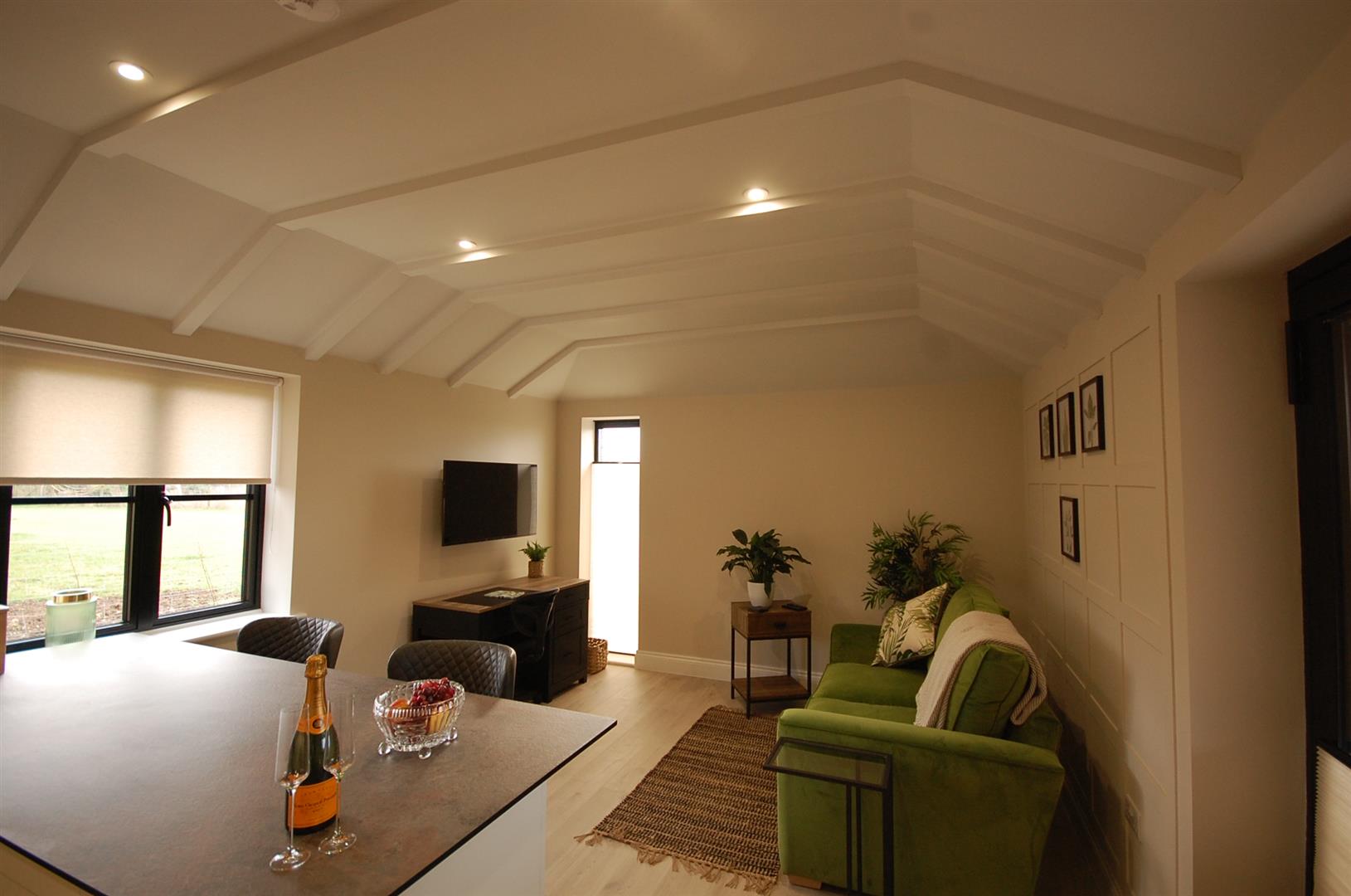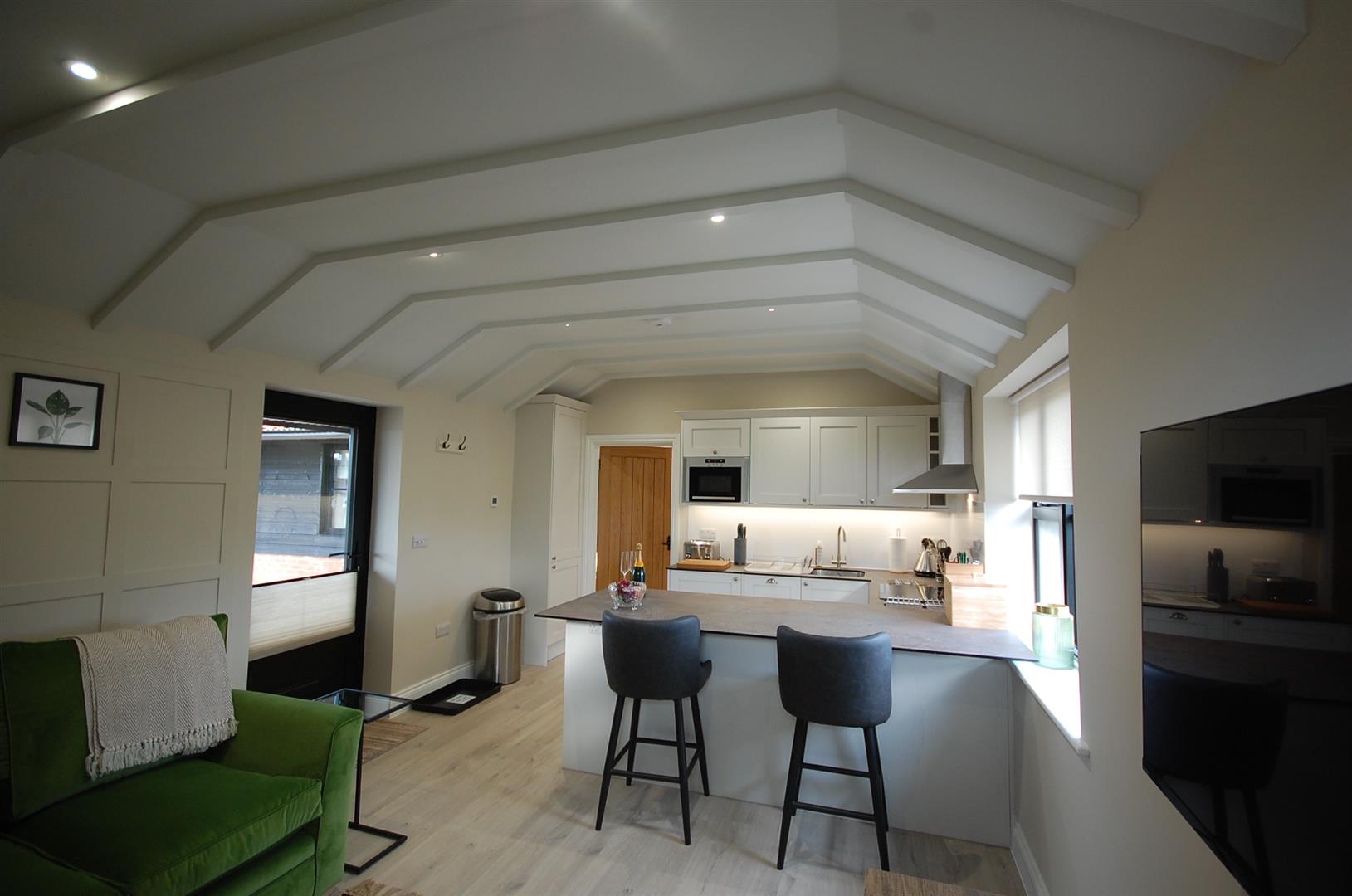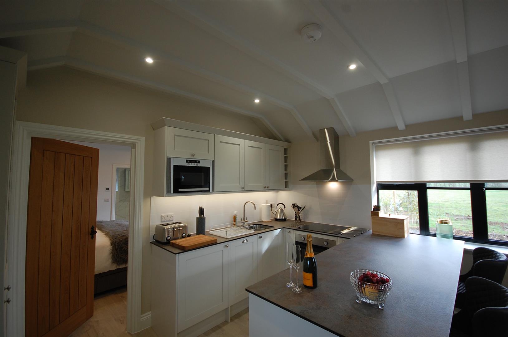Fitted with sofa, writing desk, 43u201d Smart TV and free superfast Wi-Fi. Kitchen comprising with breakfast bar and stools, fitted with washing machine dish washer (half size) built in electric oven electric hob, fridge (with small freezer compartment) & microwave.