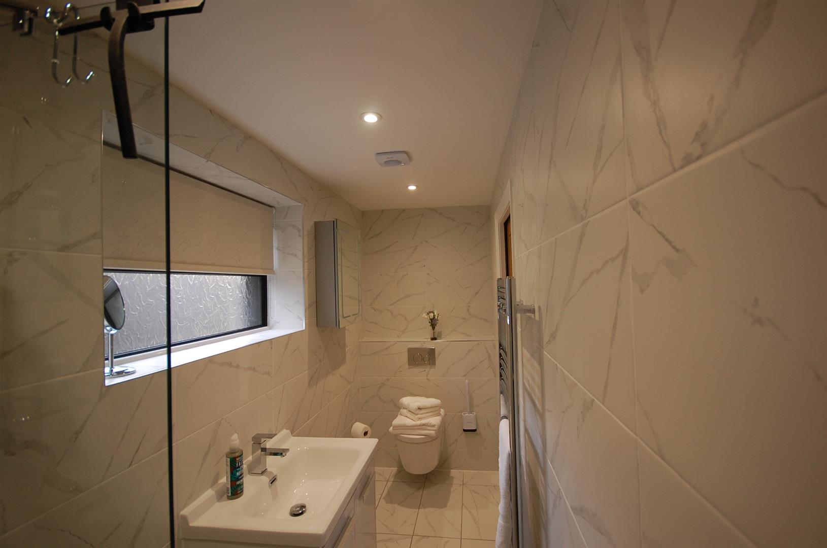 En-suite shower room has a large walk in shower, WC, vanity unit bathroom cabinet with shaver socket, heated towel rail