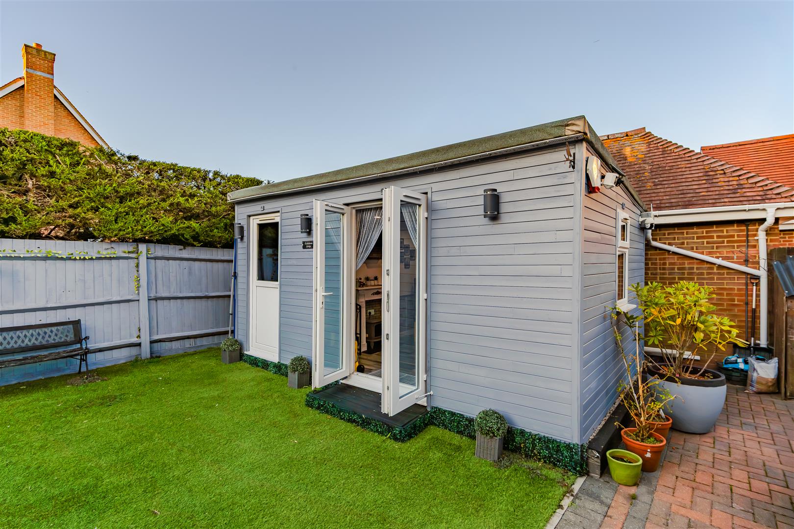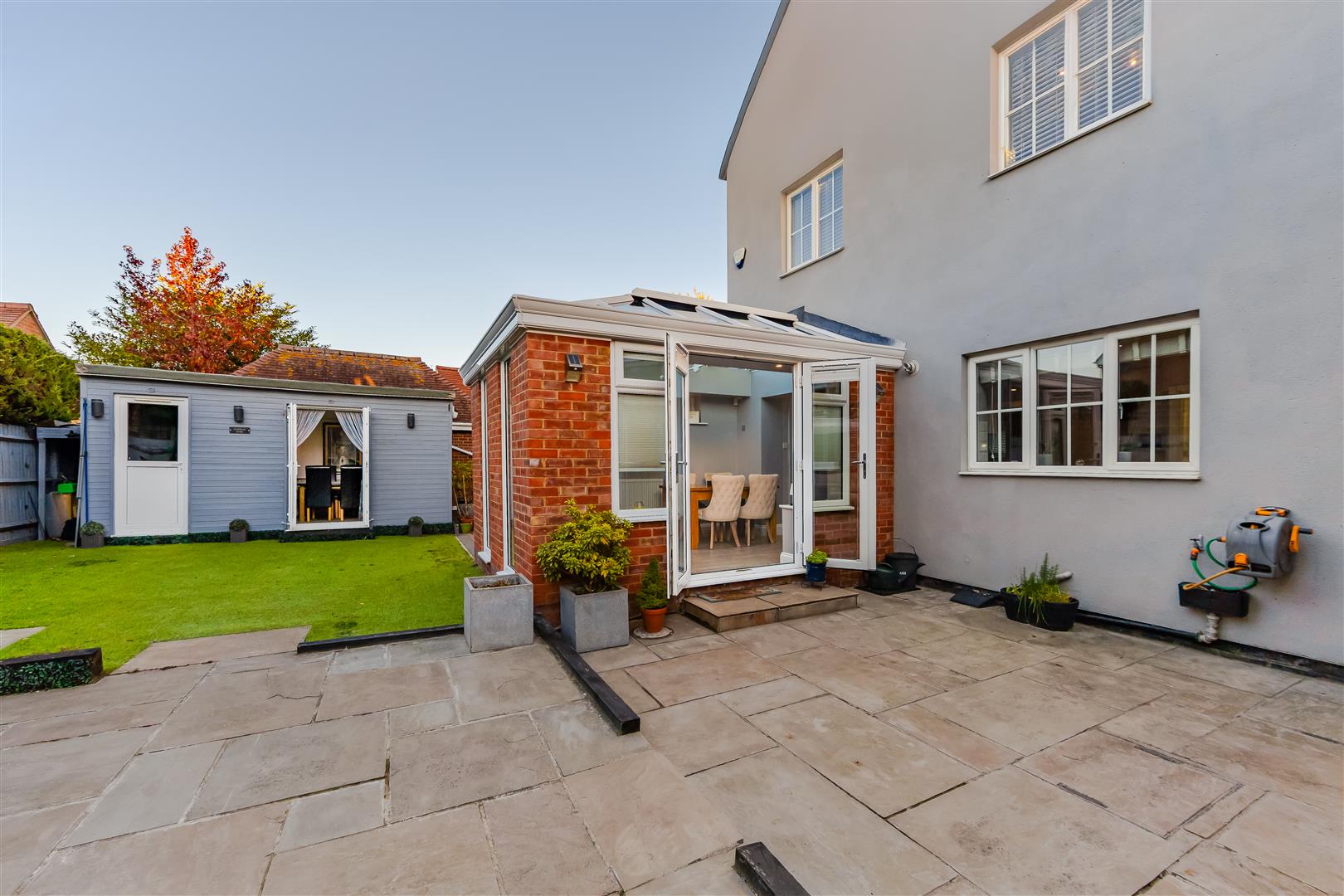 The home features versatile reception spaces, including a PART-CONVERTED GARAGE and multi-purpose OUTBUILDING/CABIN, perfect as a GYM, STUDIO, or OFFICE. Internally, high-quality finishes, vaulted ceilings, and sunken spotlights create a light, stylish, and welcoming environment.