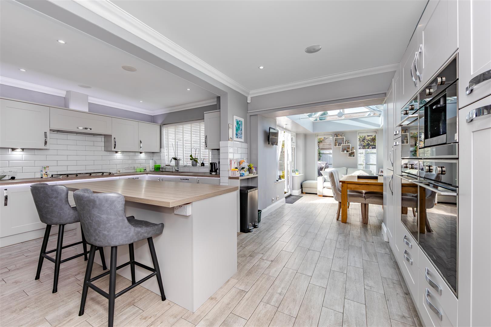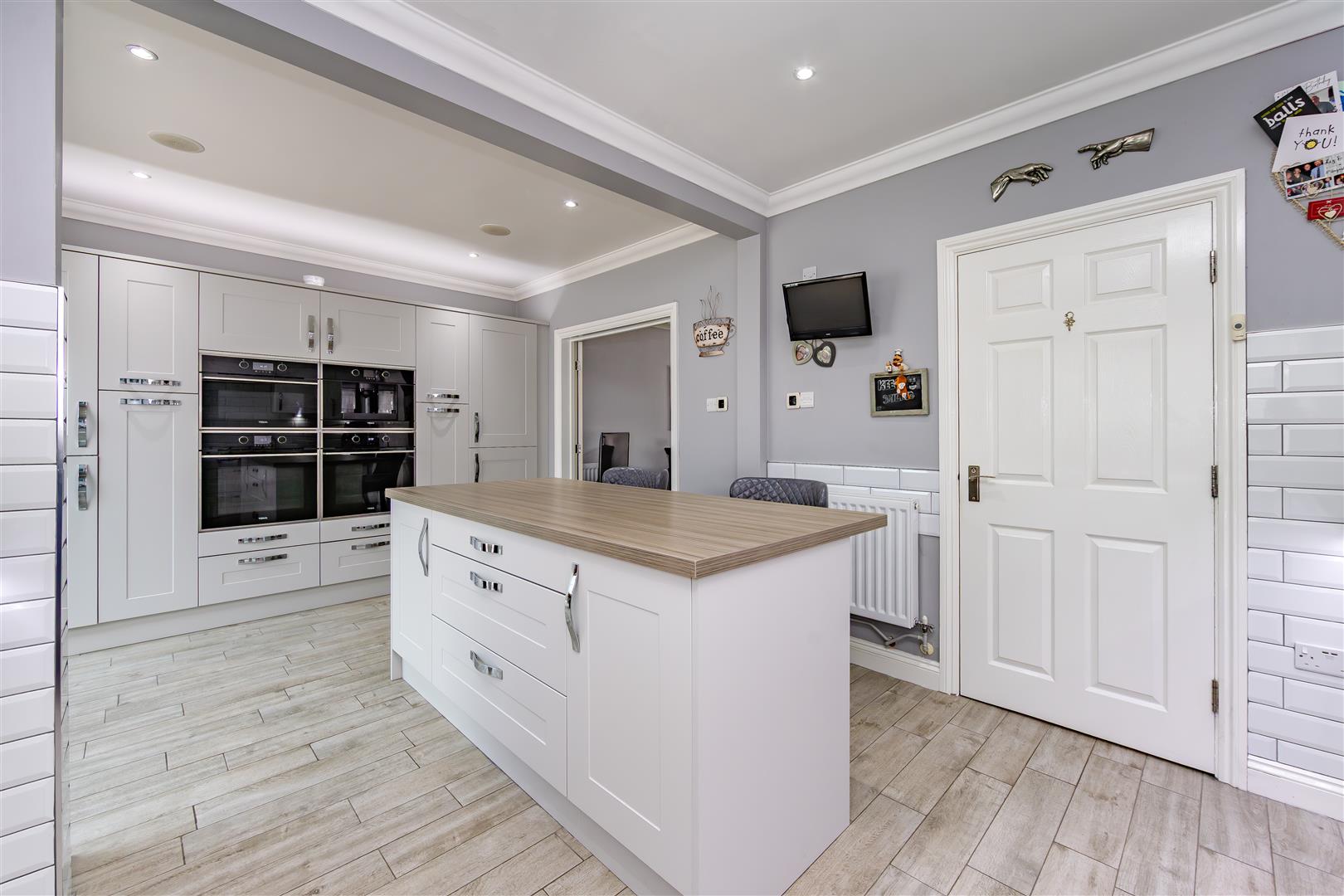 Tiled flooring, matching shaker style wall & base units with edged work surfaces, central island, one & a half sink with central mixer tap, integral eye level triple ovens & coffee machine, five ring gas hob with extractor over, integral tall fridge, tall freezer, dishwasher & washing machine, radiator, double glazed window to rear, opening to;