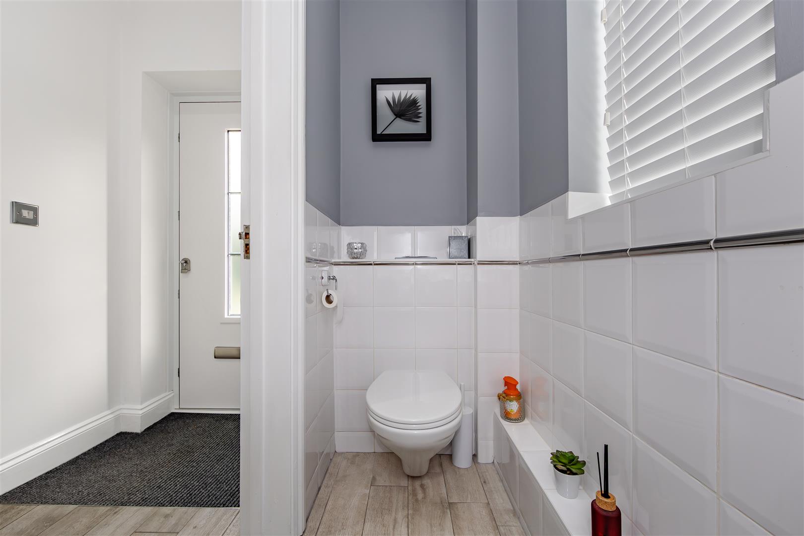 Tiled flooring, corner hand wash basin, WC, radiator, obscure double glazed window to side.
