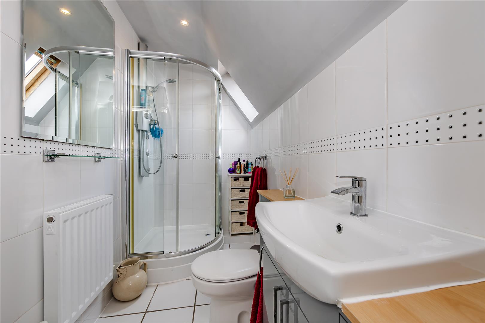 Tiled flooring, corner shower enclosure, hand wash basin & WC inset to vanity unit, radiator, velux window to side.