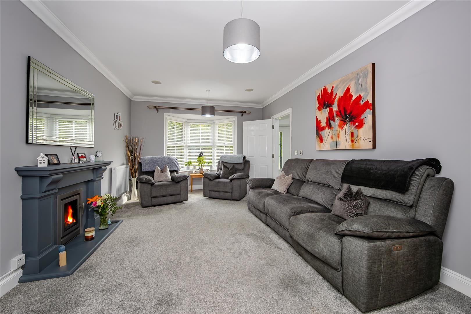 Carpet flooring, two radiators, feature fireplace with log burner, double glazed bay window to front.