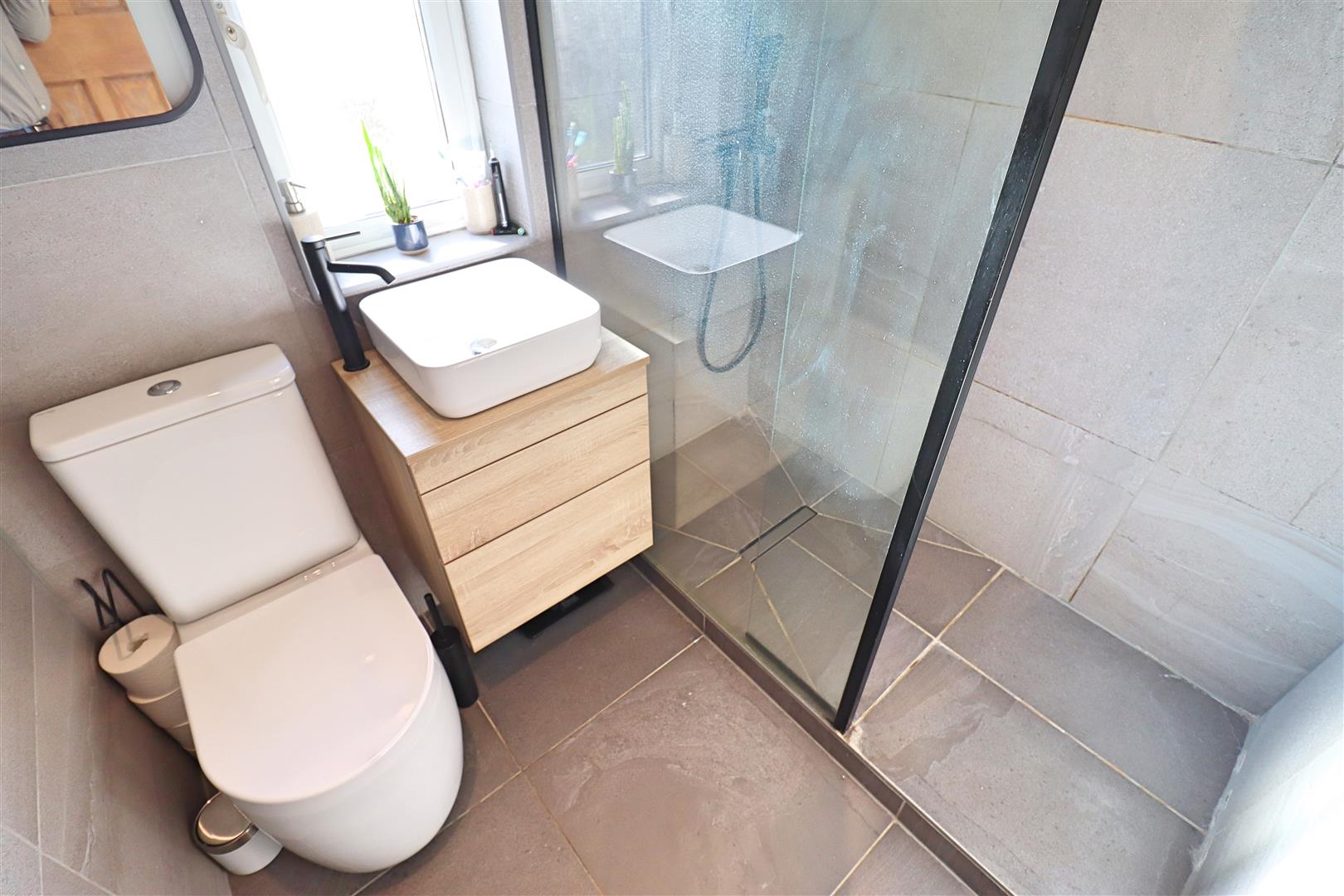Tiled flooring, walk in shower, hand wash basin inset to vanity unit, WC, radiator, obscure double glazed window to rear.