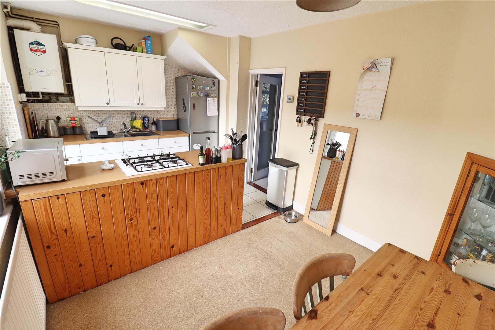 Kitchen with tiled flooring, wall & base units, sink, central peninsula, integral oven & four ring gas hob, spaces for appliances, dining area with carpet flooring, double glazed window & door to Conservatory.