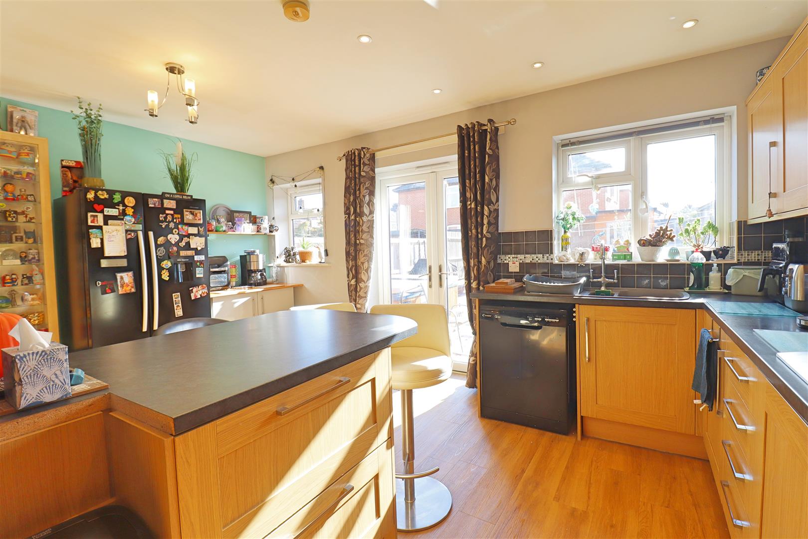 LVT flooring, matching base & wall units with edged work tops, one & a half sink with central mixer tap, breakfast bar, integral eye level double oven, four ring gas hob with extractor over, spaces for fridge/ freezer. dishwasher, washing machine & tumble dryer, two double glazed windows & french doors to rear.