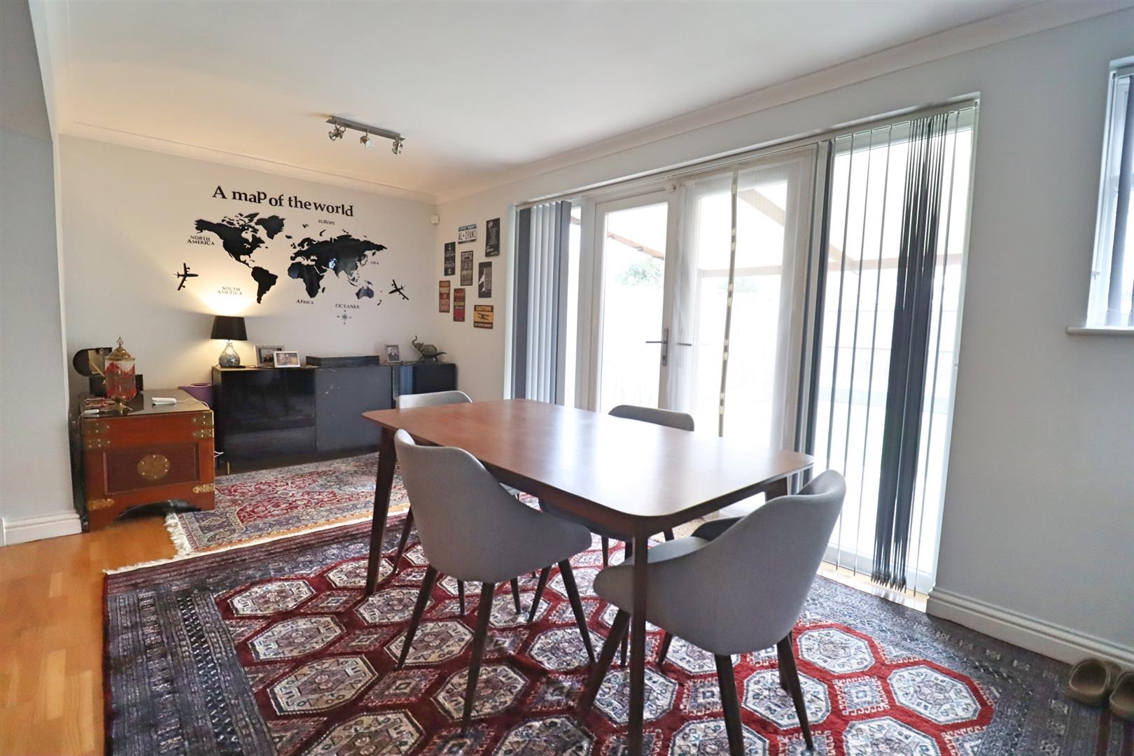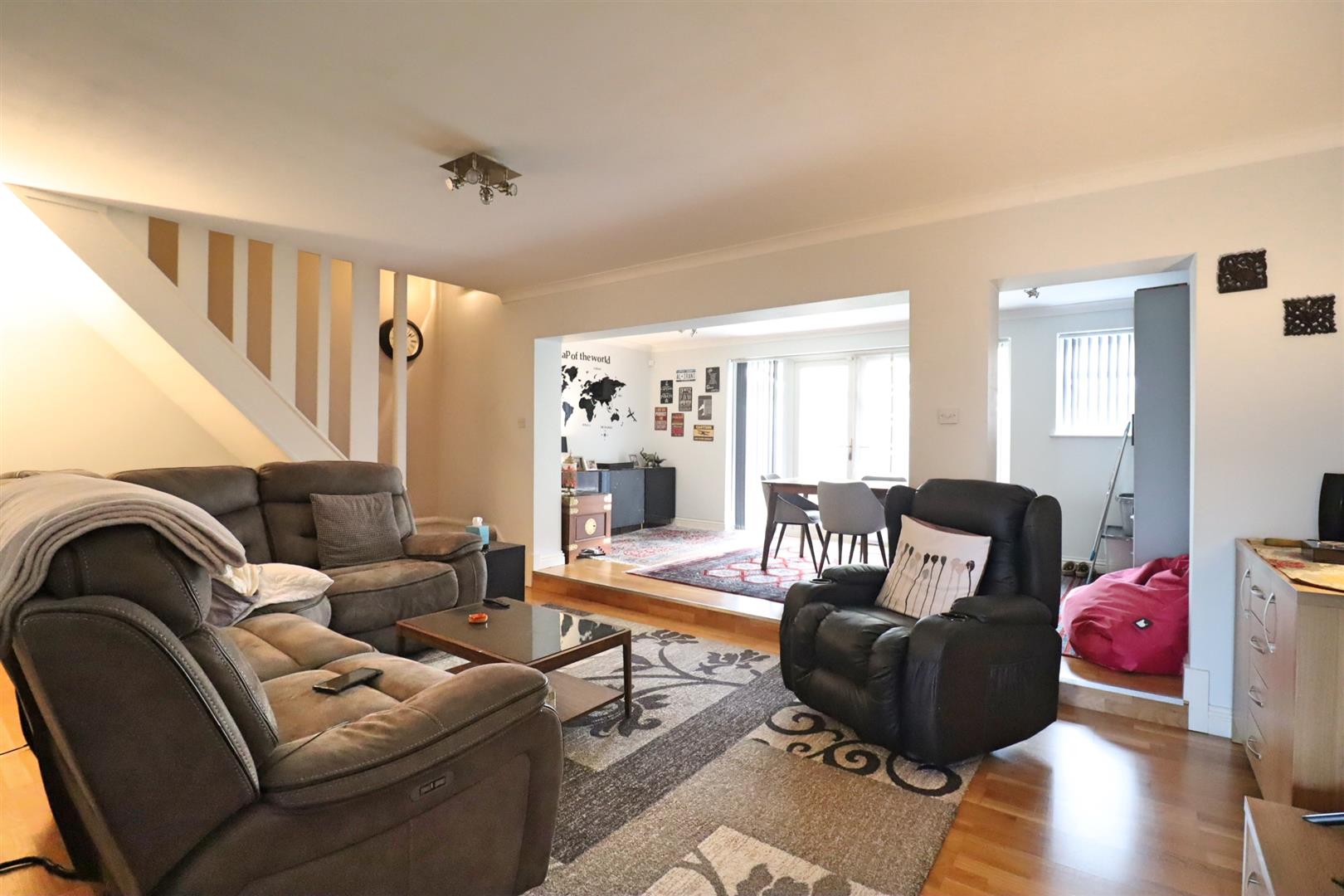 Laminate flooring, stairs rising to first floor, window to rear, patio doors leading to rear garden