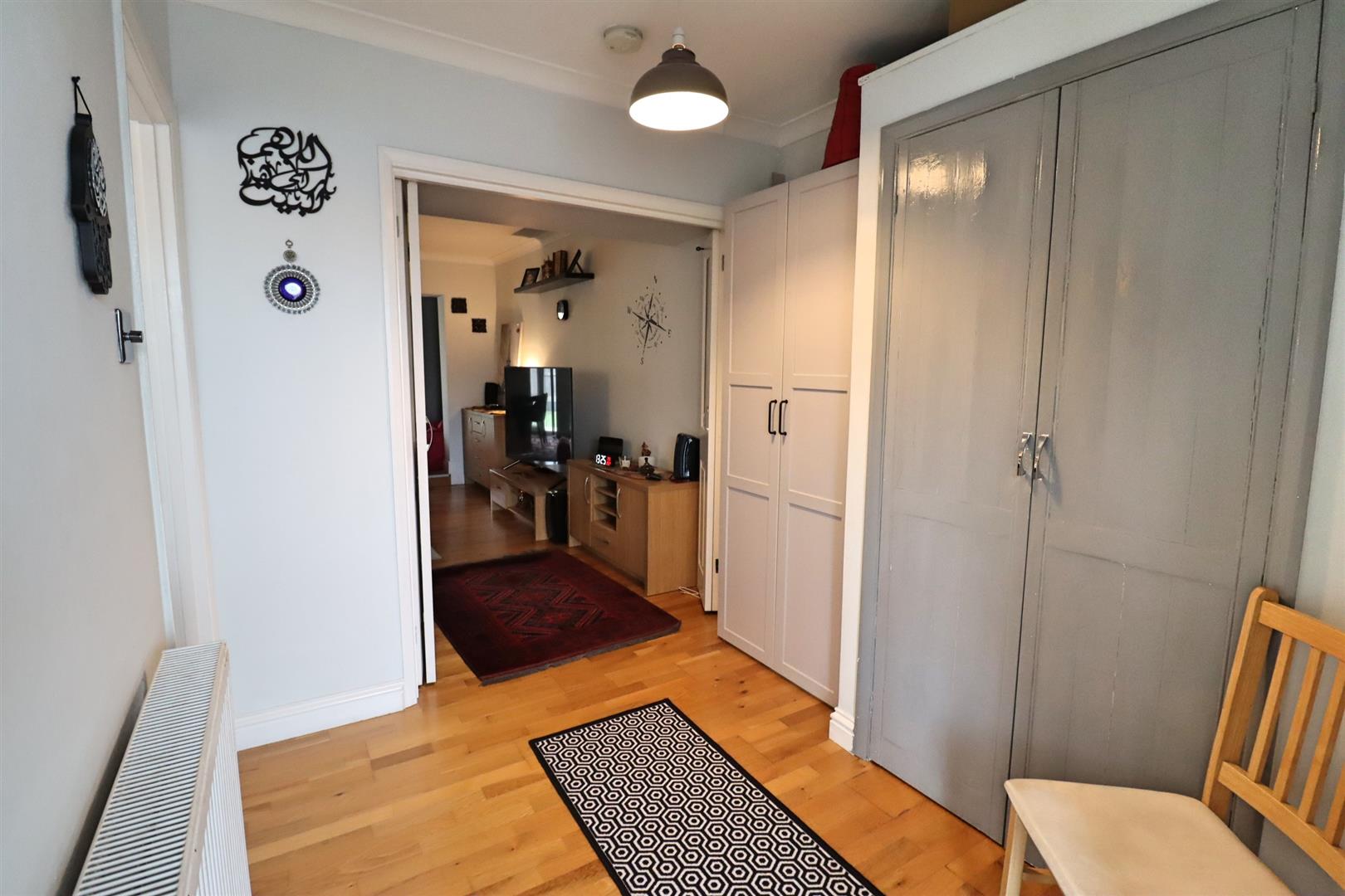 Laminate flooring, storage cupboard, radiator, doors to;