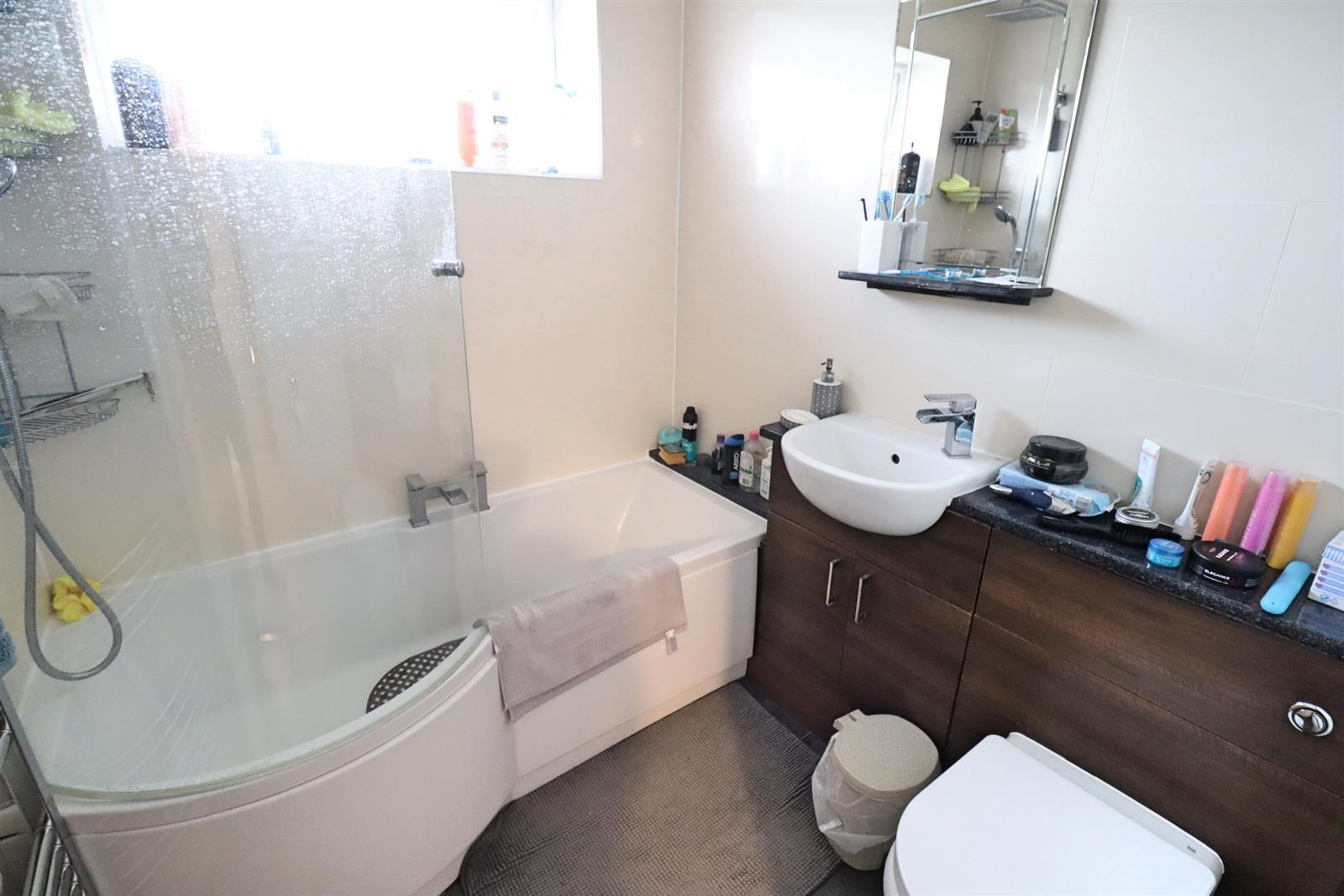 Tiled flooring, bath with shower over, WC, hand wash basin inset to vanity unit, heated towel rail, obscure window to front