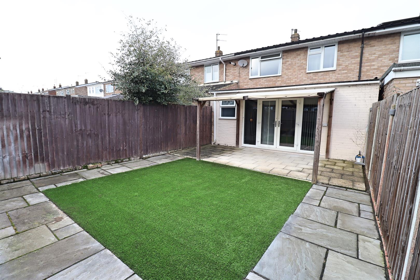 Low maintenance rear garden comprising of a patio seat area, remainder laid to artificial lawn, enclosed by panel fencing