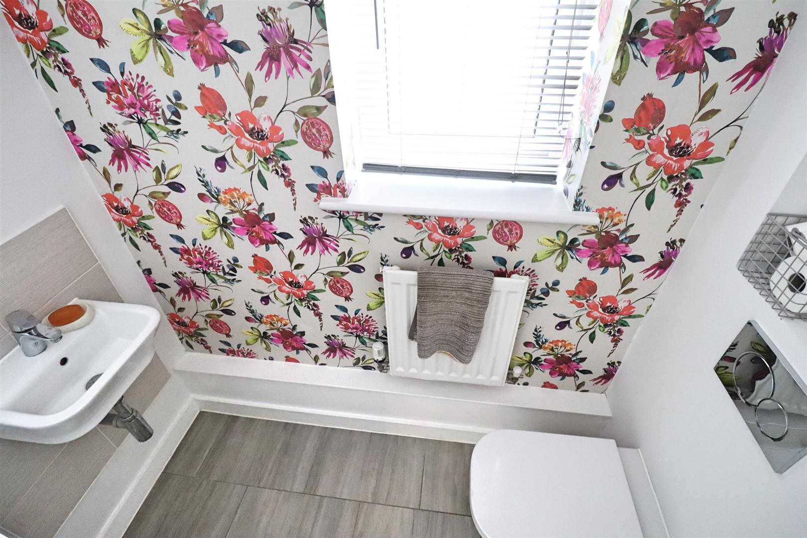 Tiled flooring, wall mounted hand wash basin, WC, radiator, obscure double glazed window to side.