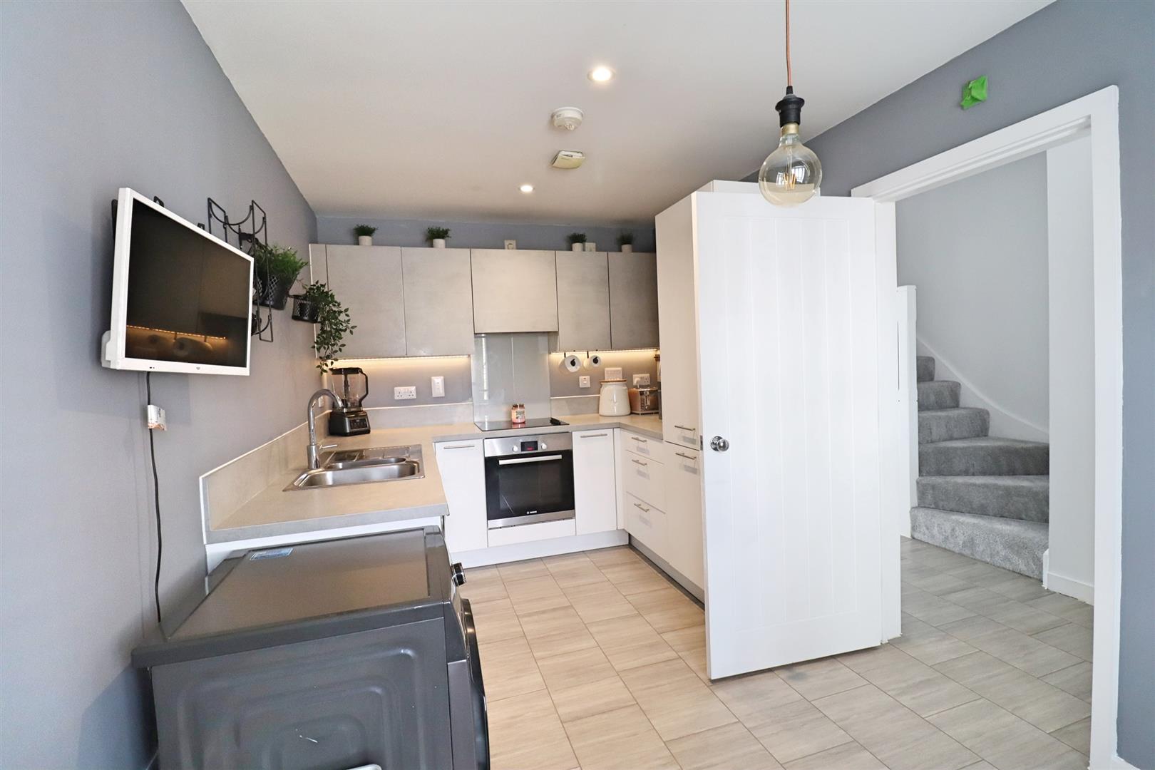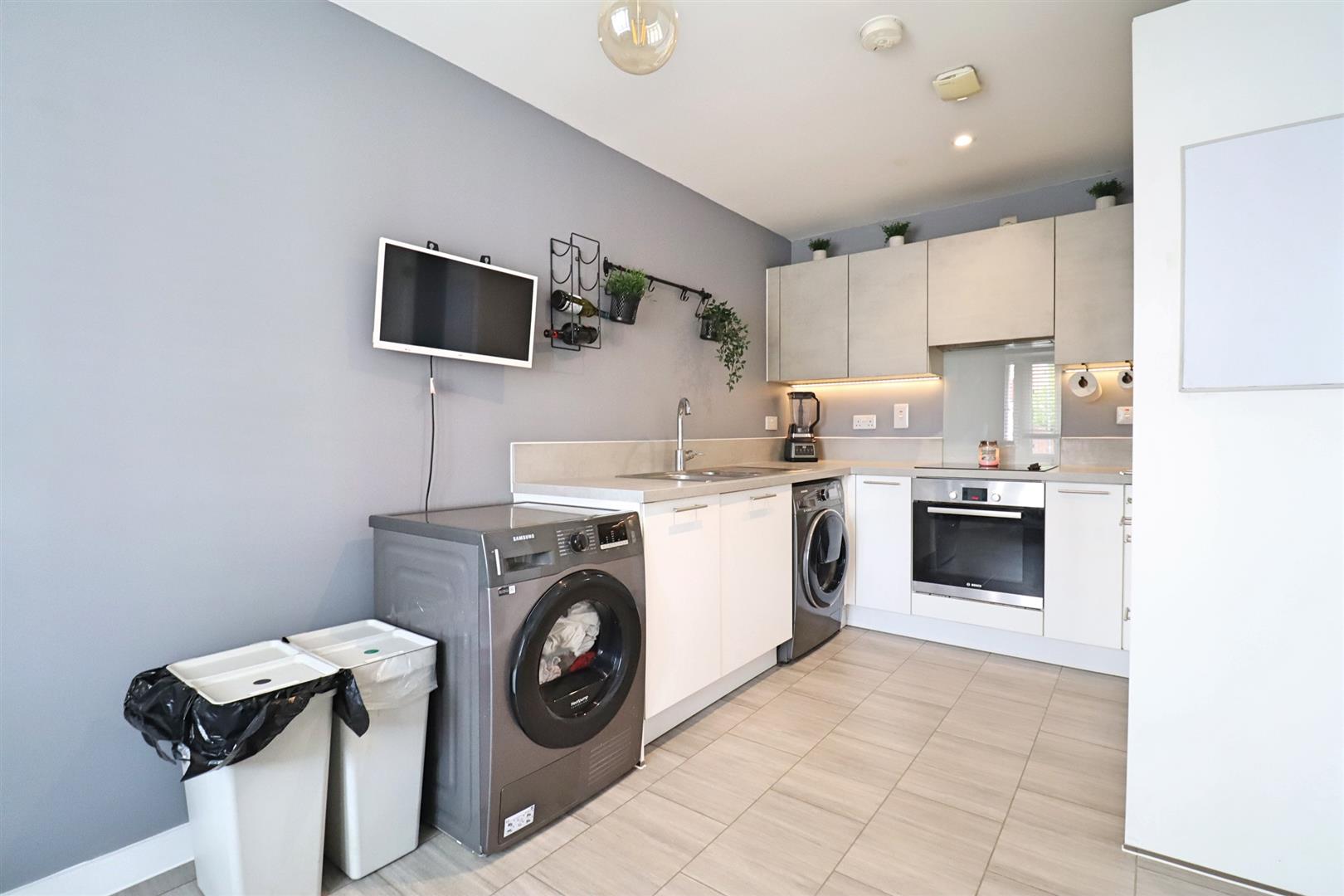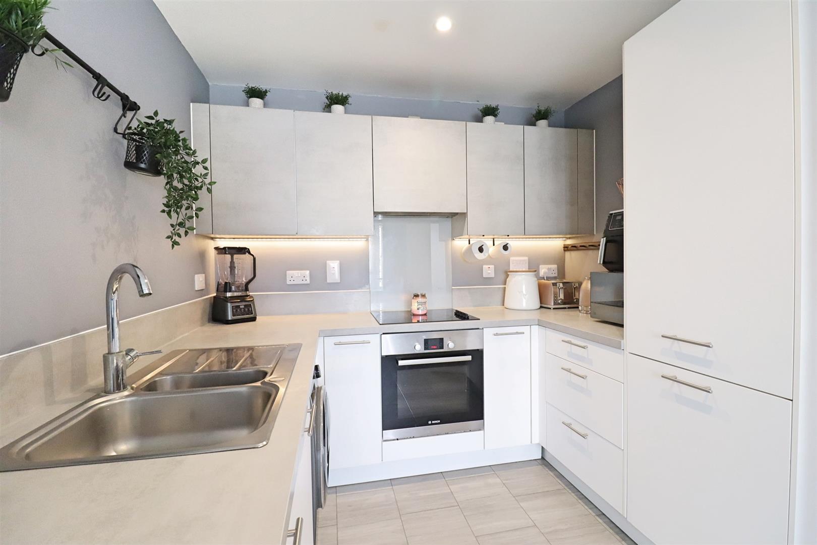 Tiled flooring, high gloss wall & base units with edged work surfaces, one & a half stainless steel sink, integral oven, four ring hob, fridge/ freezer & dishwasher, space for washing machine, double glazed bay window to front, radiator.
