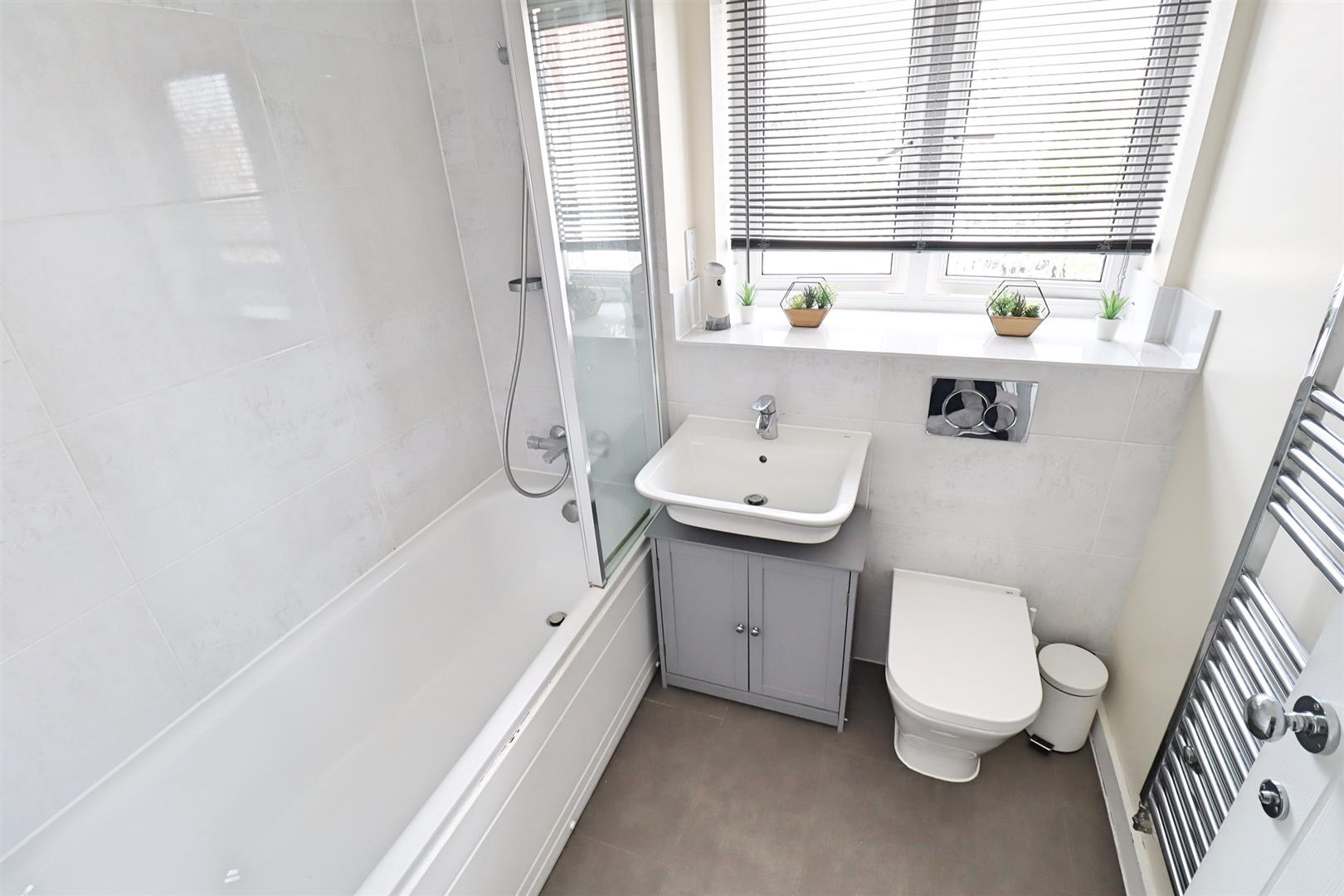 Bath with shower over, hand wash basin set onto vanity unit, WC, obscure double glazed window to front, chrome heated radiator.