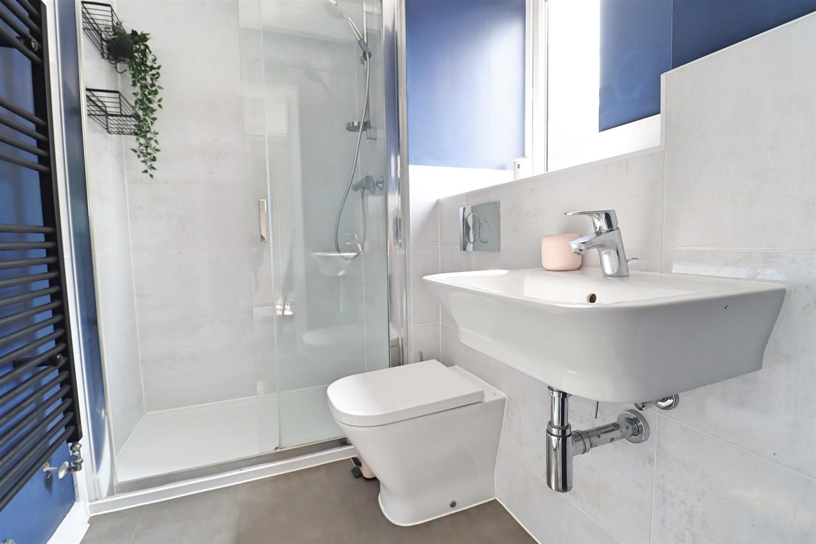 Walk in double shower, wall mounted hand wash basin, WC, obscure double glazed window to rear, radiator.