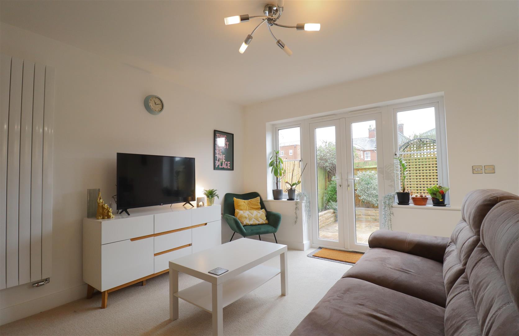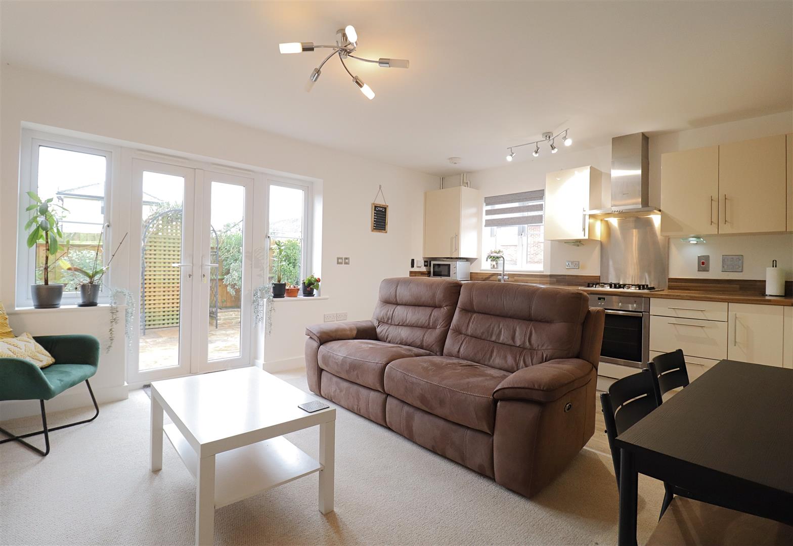 Lounge area with carpet flooring, radiator, double glazed french doors to garden. Kitchen with LVT flooring, high gloss wall & base units with roll edged work surfaces, one & a half stainless steel sink with mixer tap, integral oven with four ring gas hob & extractor over, integral fridge/ freezer, spaces for washing machine & dishwasher, double glazed window to side.