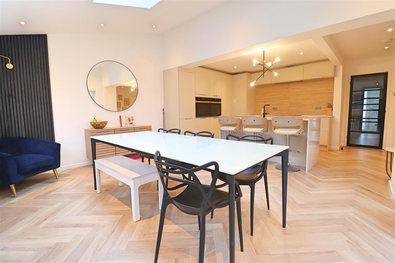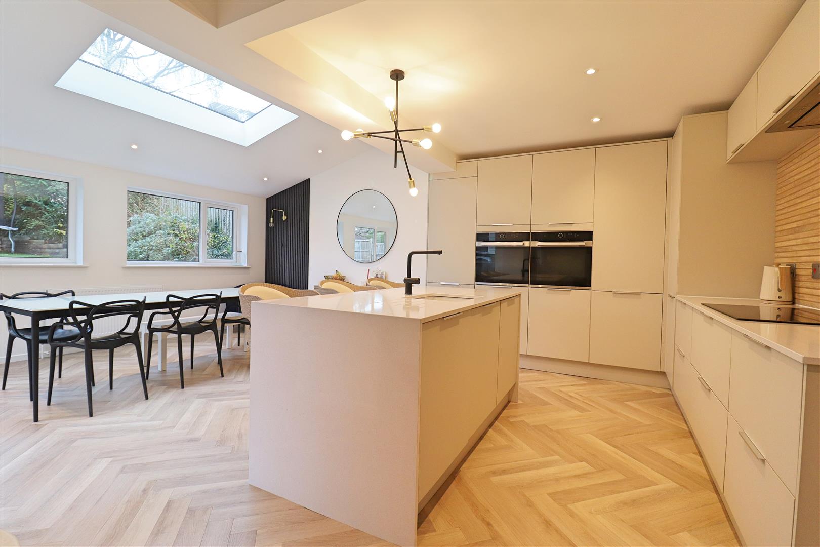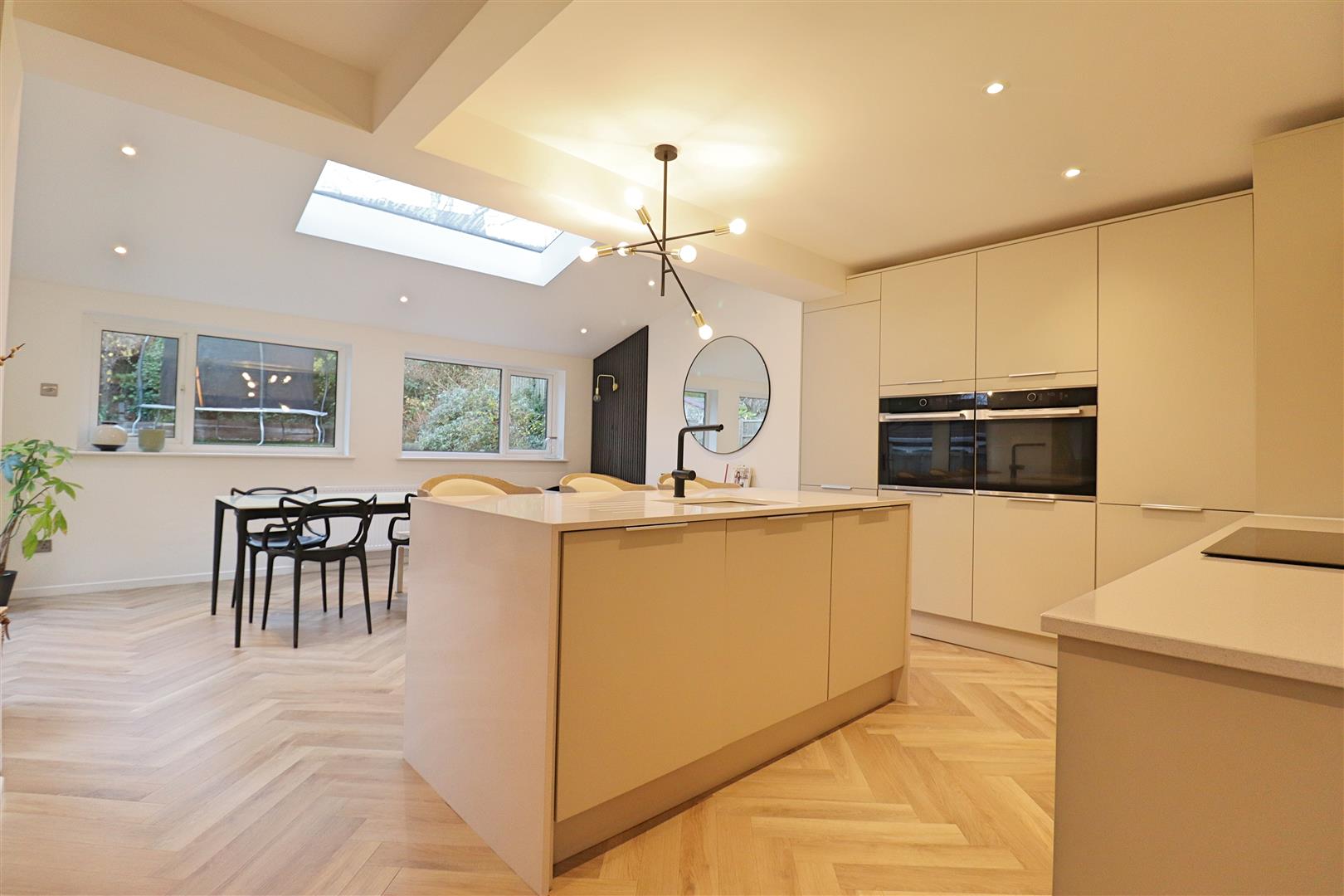 LVT flooring, wall & base units, central island with inset sink, integral ovens, fridge/freezer & dishwasher, induction hob, double glazed windows & patio doors to rear.