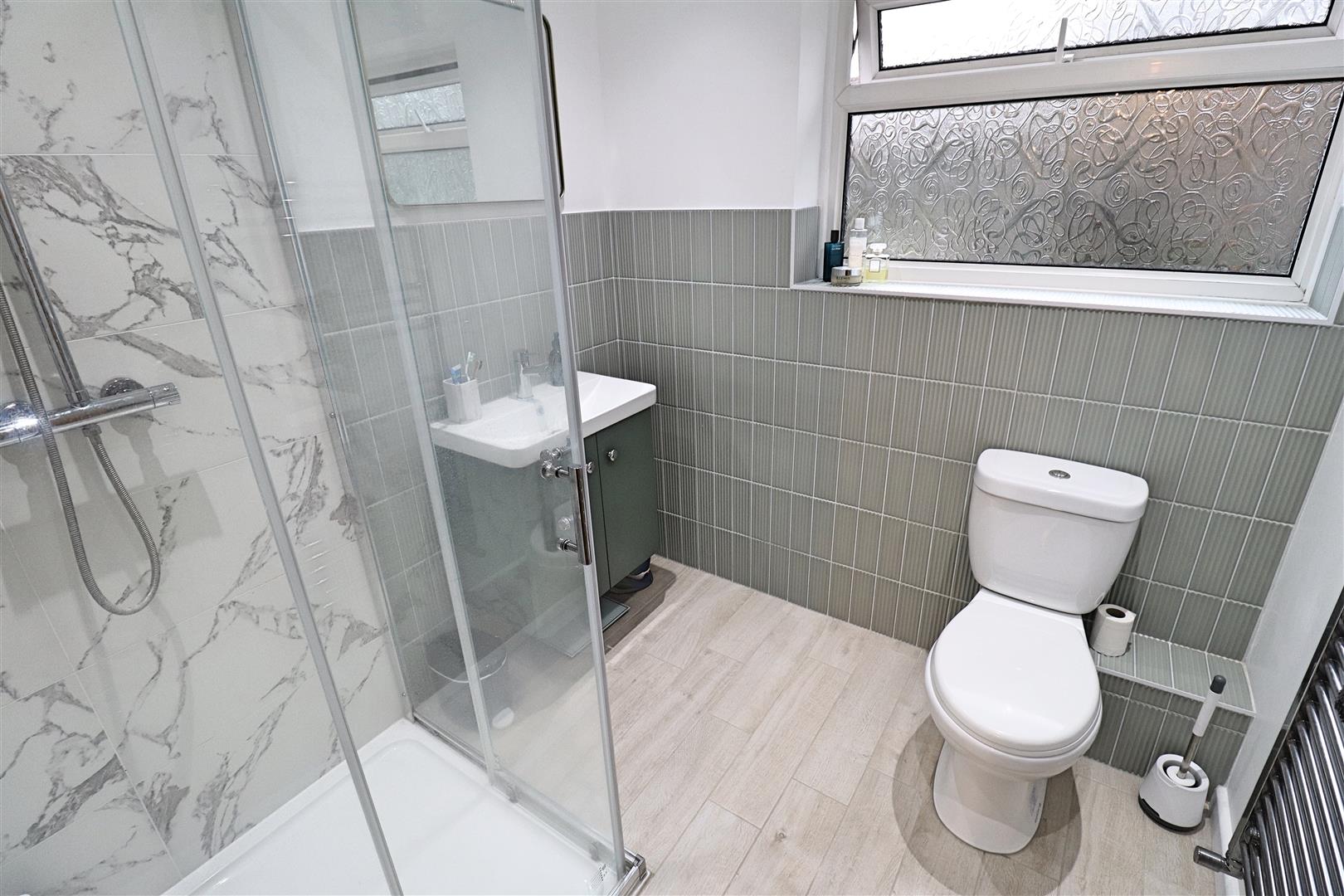 Obscure double glazed window to rear, shower enclosure, hand wash basin inset to vanity unit, WC, heated towel radiator.