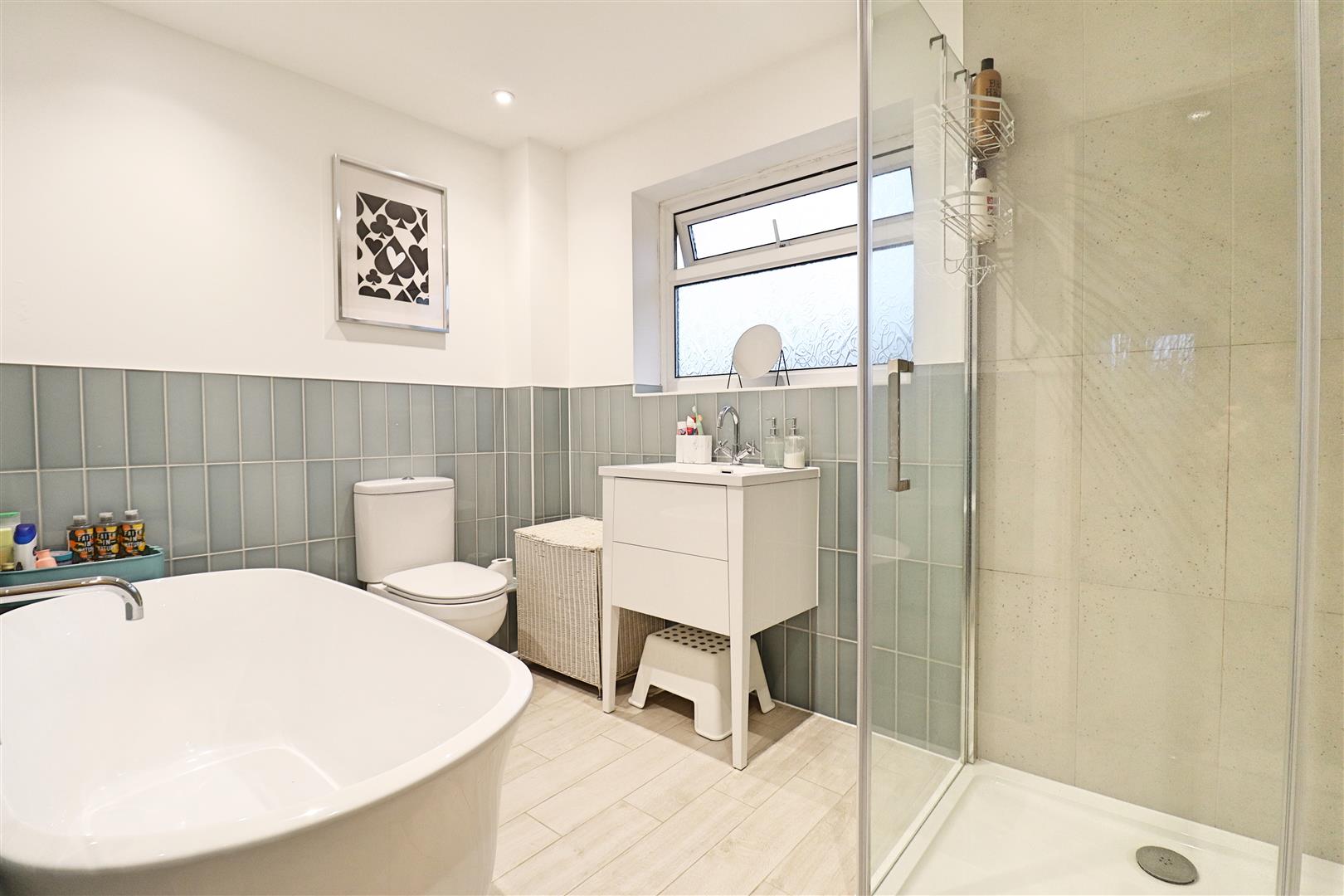 Obscure double glazed window to rear, freestanding bath, shower enclosure, hand wash basin inset to vanity unit, WC, tiled flooring.