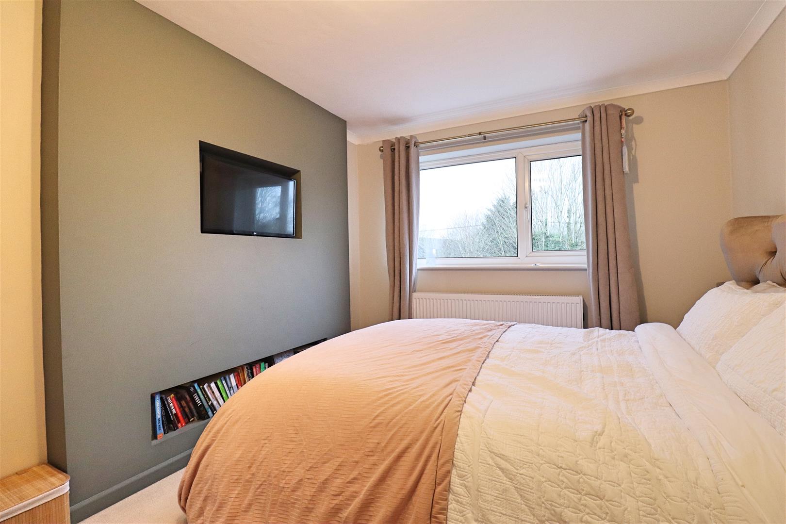 Carpet flooring, media wall with electric fireplace, double glazed window to front, radiator.