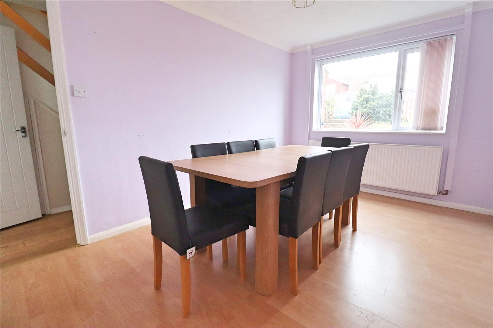 Laminate flooring, stairs rising to first floor, radiator, doors to;
