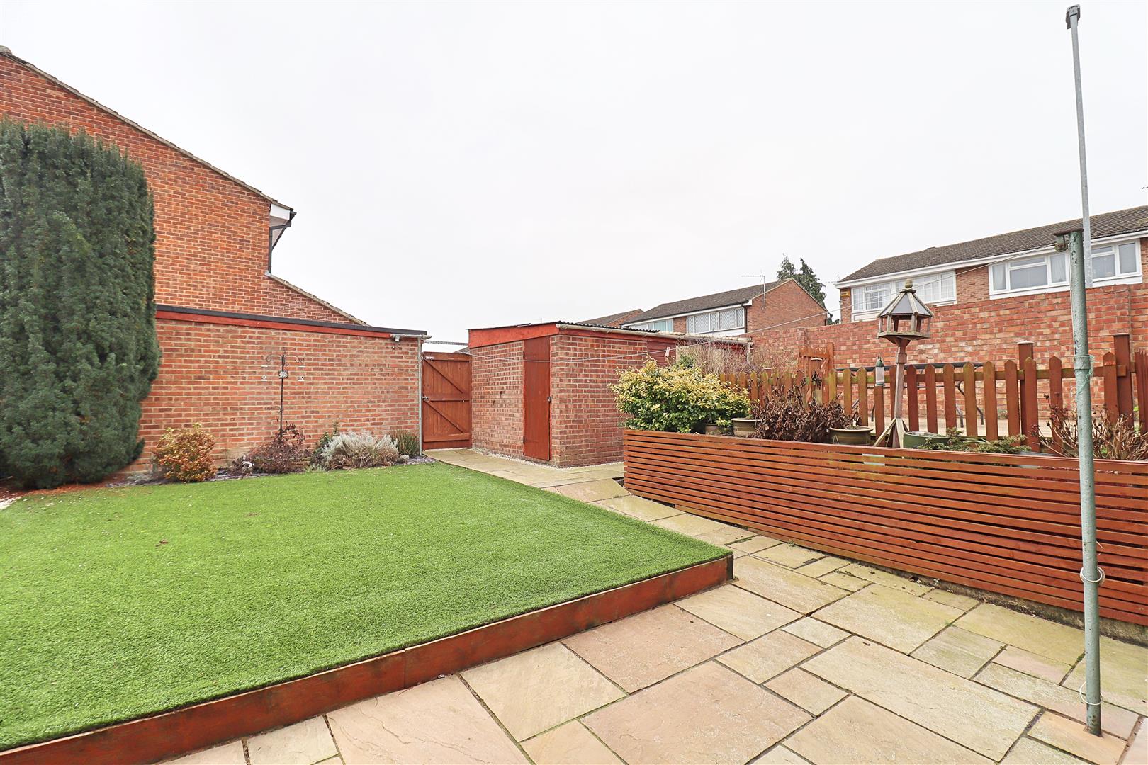 Low maintenance landscaped garden, patio leading to artificial lawn, raised entertaining area, shed & brick built outbuilding, gated access.