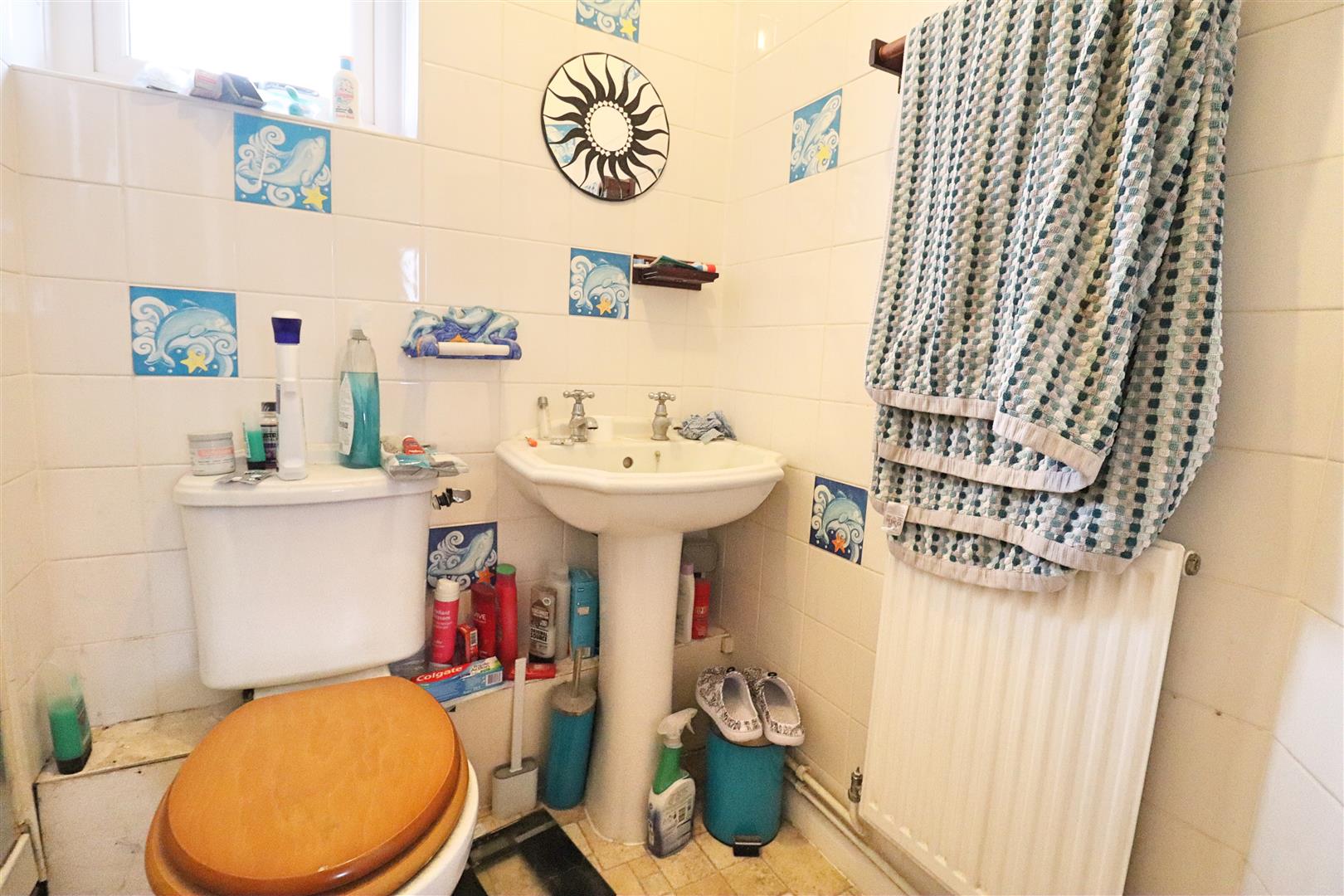 Laminate flooring, hand wash basin, WC, radiator, obscure double glazed window to rear.