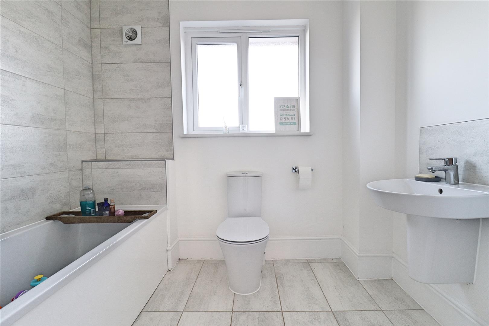 Tiled flooring, bath with shower over, hand wash basin, WC, chrome heated towel rail, obscure double glazed, extractor fan, window to rear.
