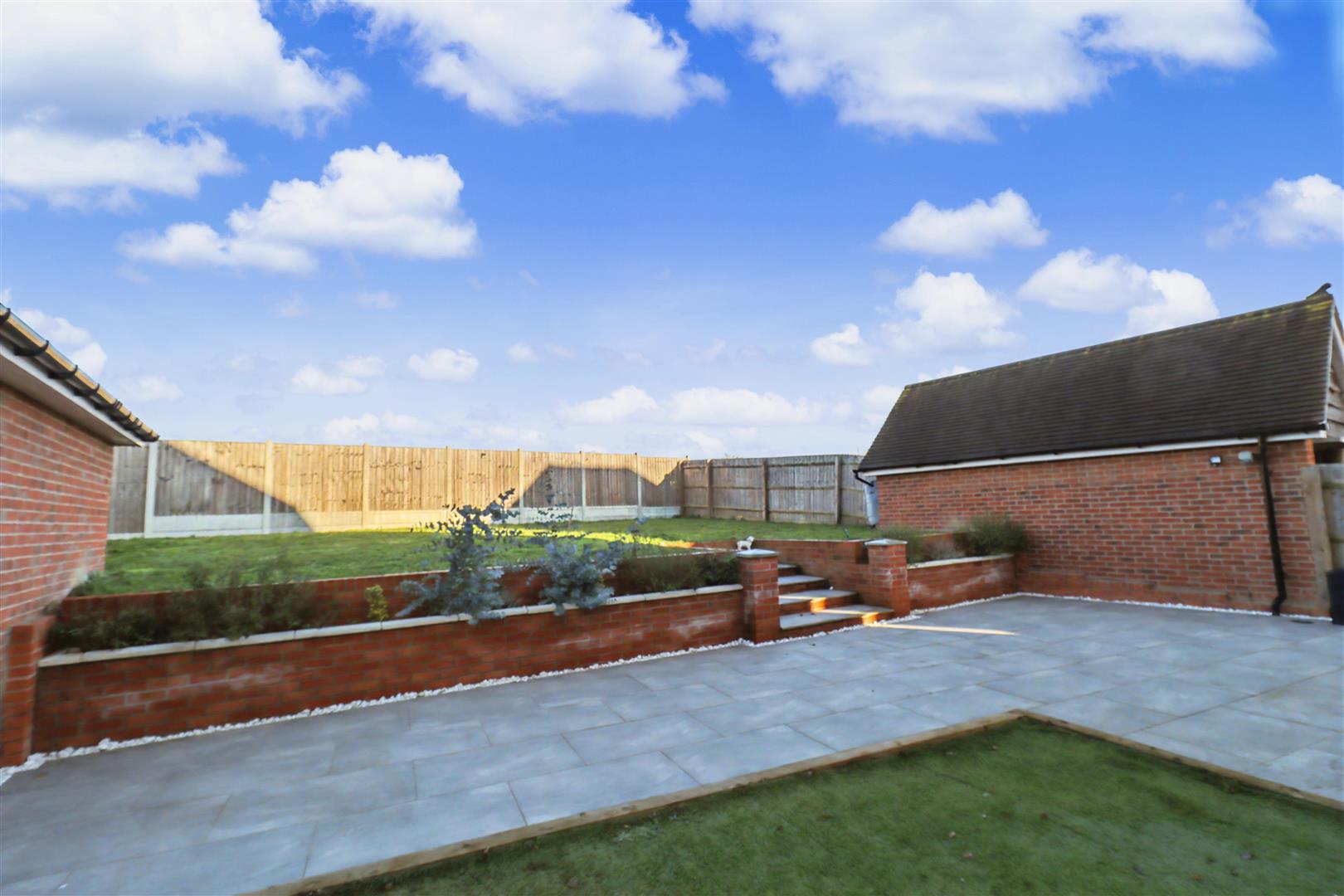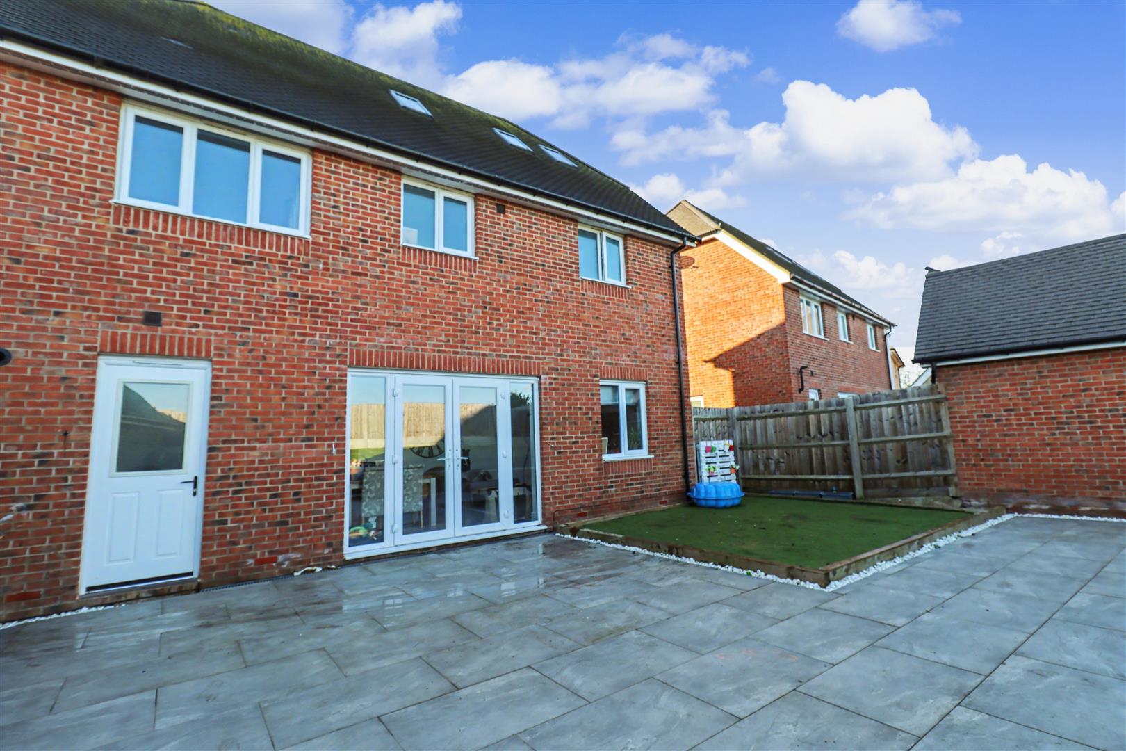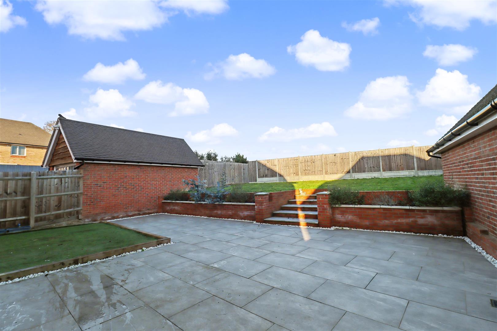 Generous rear garden commencing with porcelain paved patio with raised artificial play area, brick borders with steps leading to lawned area. Enclosed by panel fencing, side gate leading to front of property.