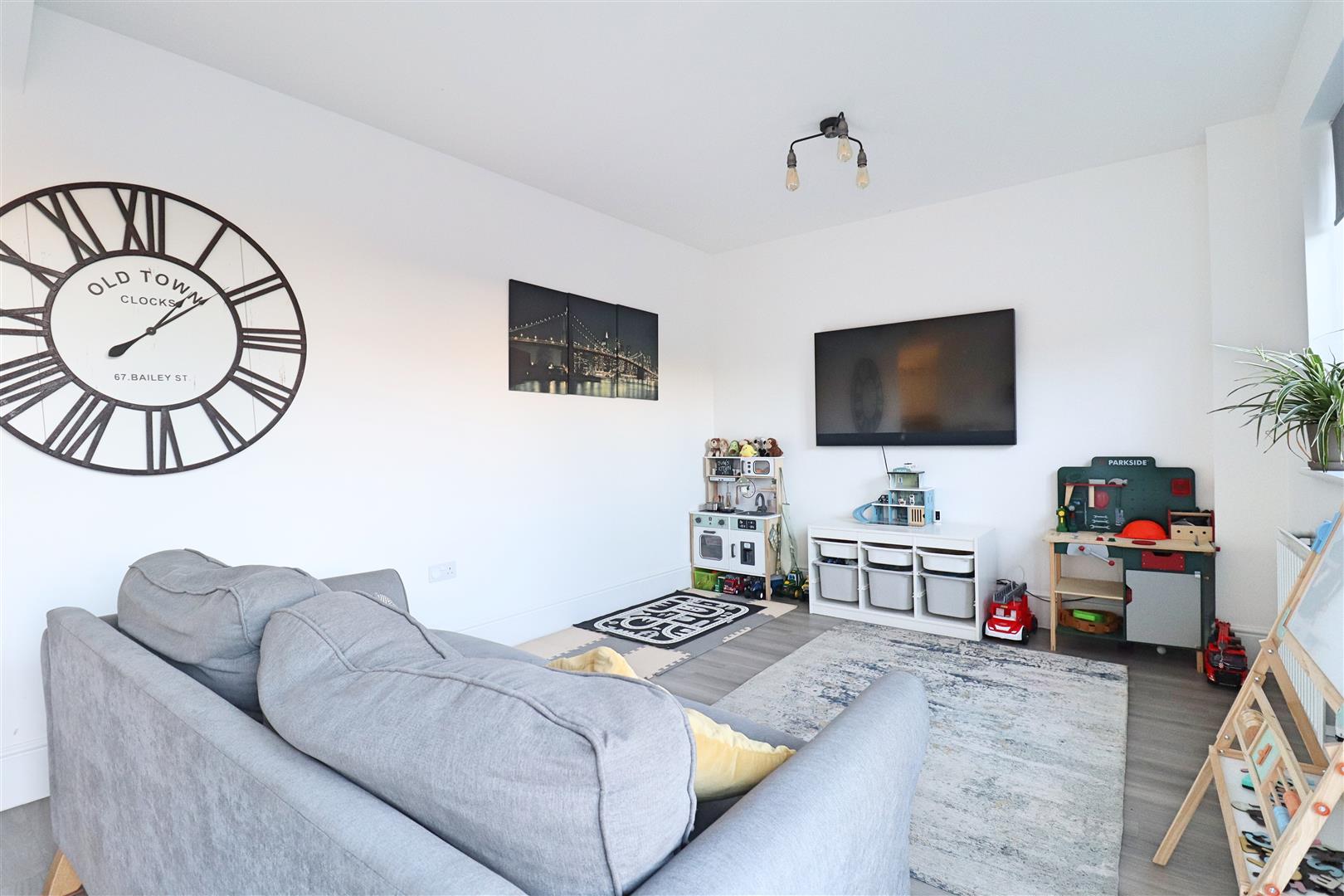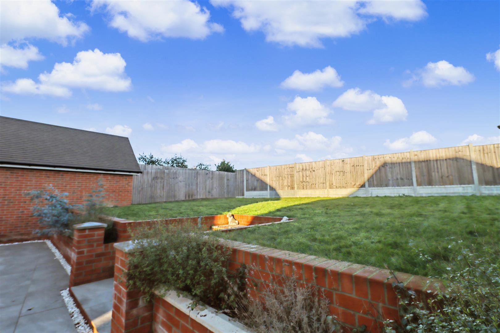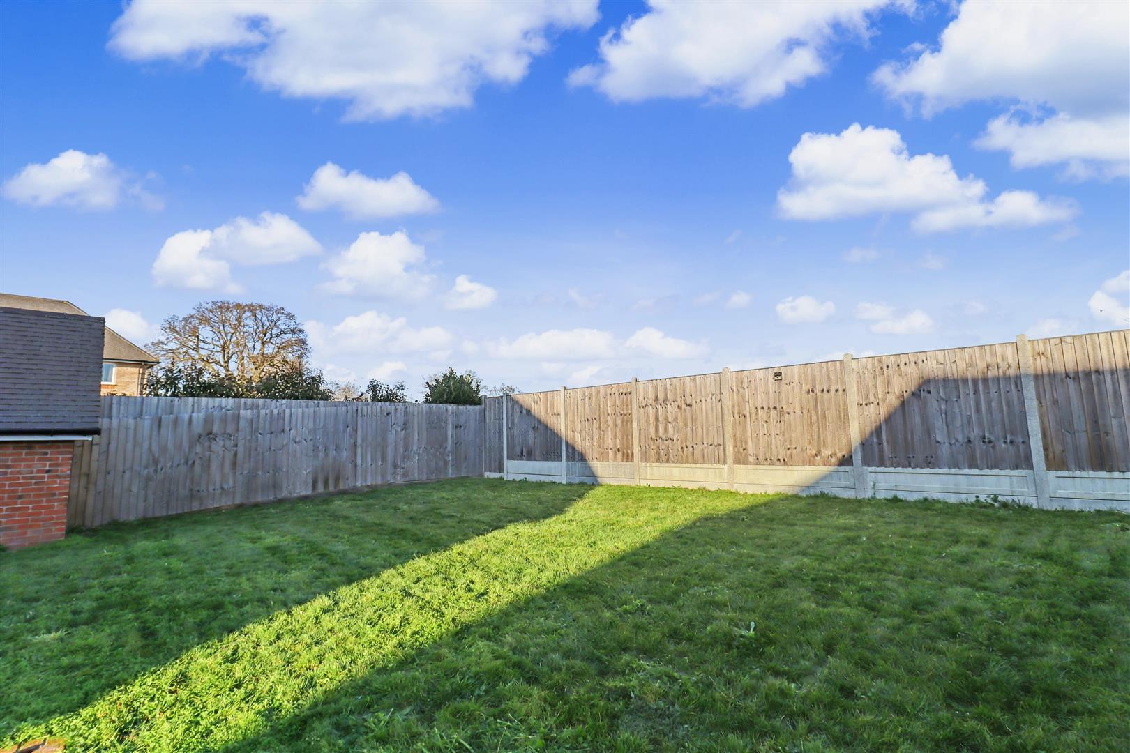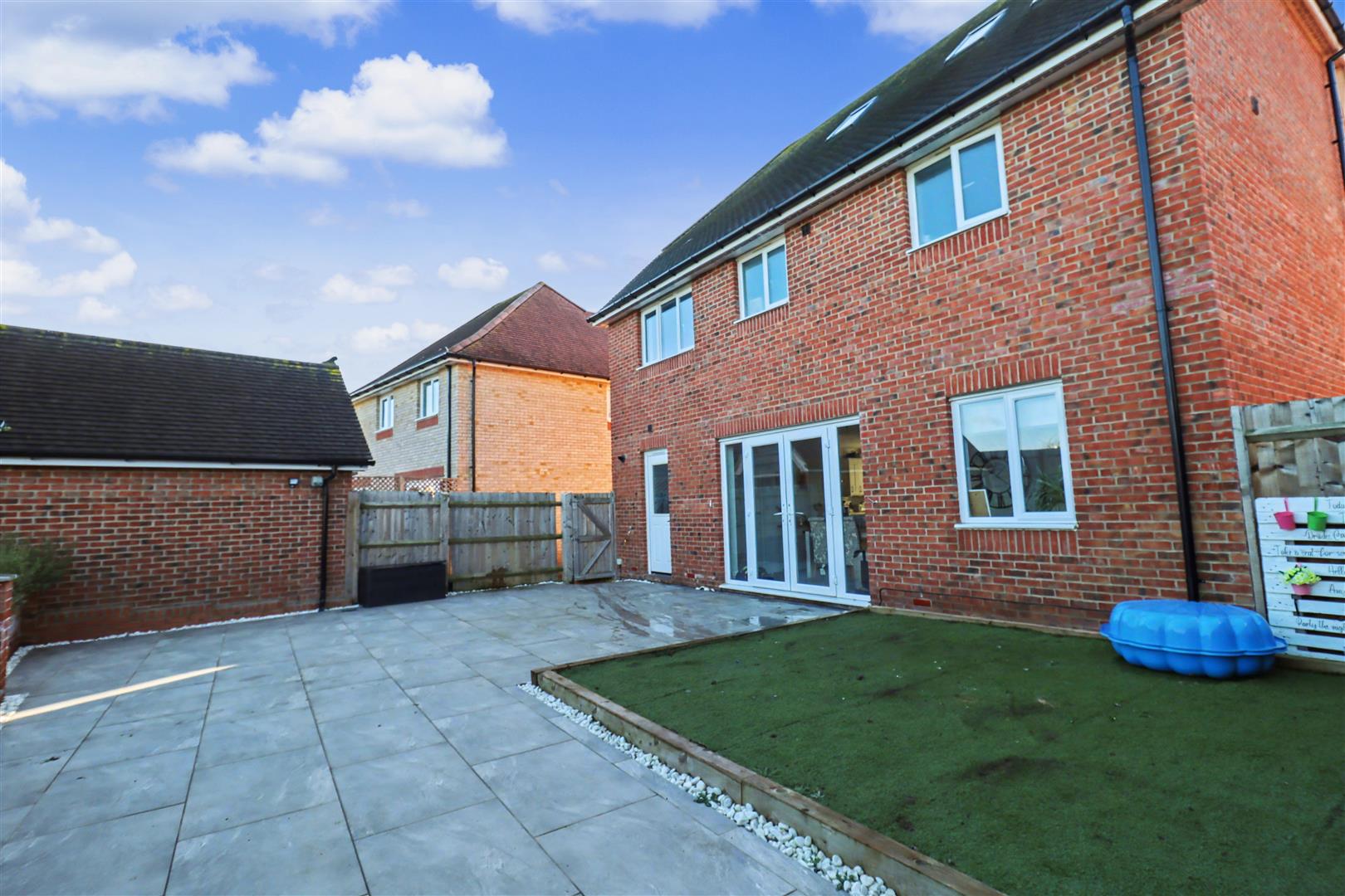 Generous rear garden commencing with porcelain paved patio with raised artificial play area, brick borders with steps leading to lawned area. Enclosed by panel fencing, side gate leading to front of property.