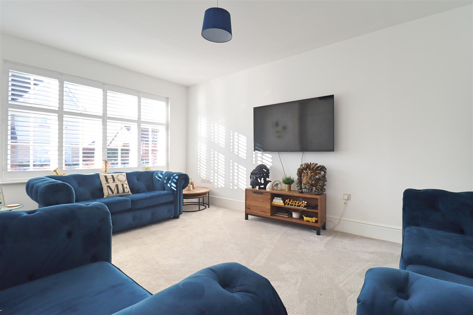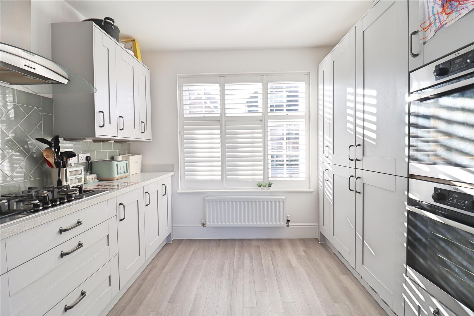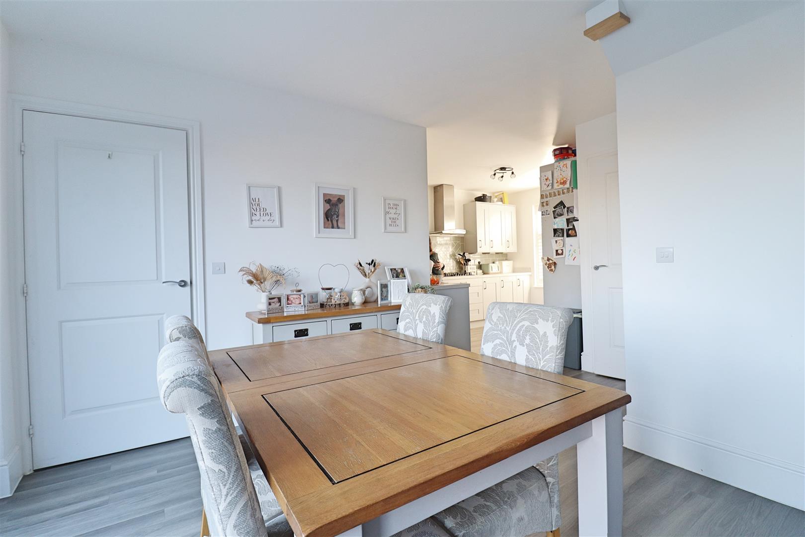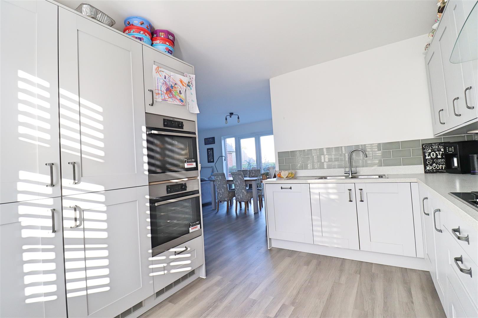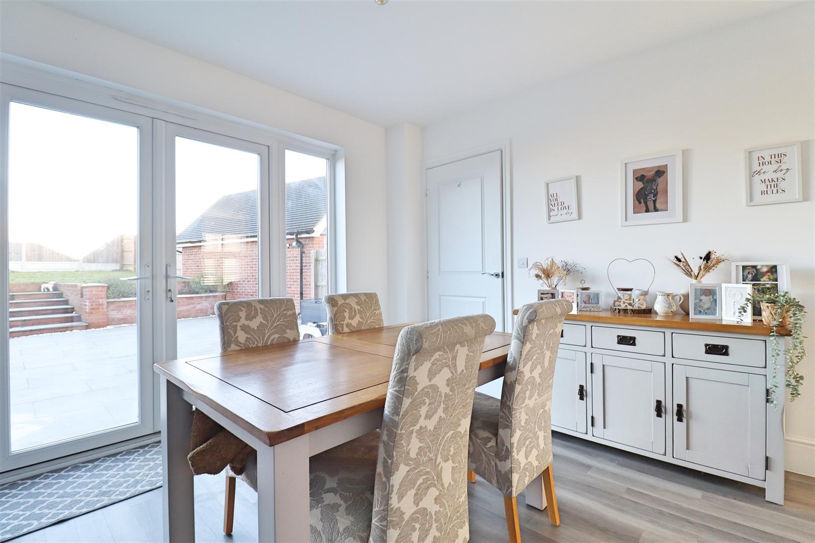 Amtico flooring, shaker style units with edged work surfaces, 2x stainless steel sinks & drainer with mixer tap, 2x integral eye level double ovens, 5 ring gas hob with extractor over, 2x integral fridge freezers & dishwasher, double glazed window to front, radiator, large open space for dining/family room with double glazed window, under-stair storage cupboard & french doors to garden, radiator, door to: