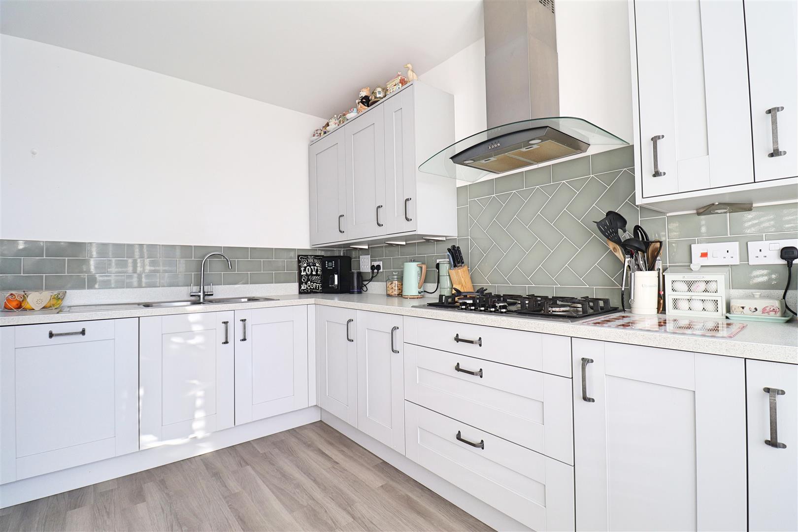 Amtico flooring, base units, stainless steel sink & drainer with mixer tap, spaces for washing machine & tumble dryer, extractor fan, door to rear garden door to;