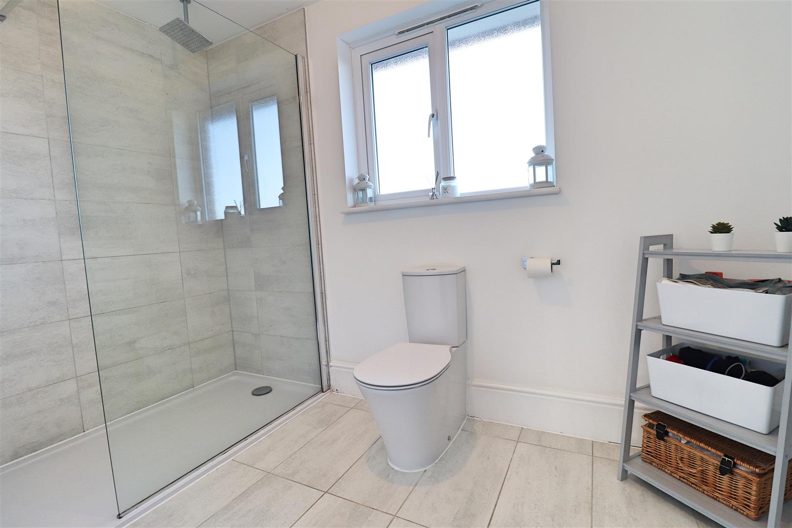 Tiled flooring, shower enclosure, hand wash basin, WC, chrome heated towel rail, extractor fan