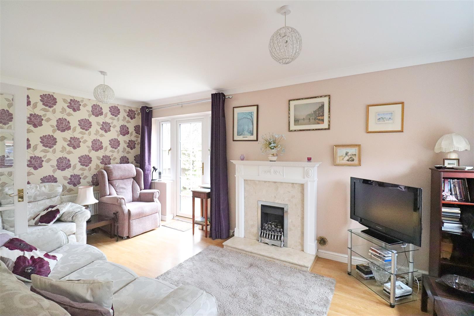 Laminate flooring, two radiators, feature fireplace, double glazed window to front, door to Garden, doors to;